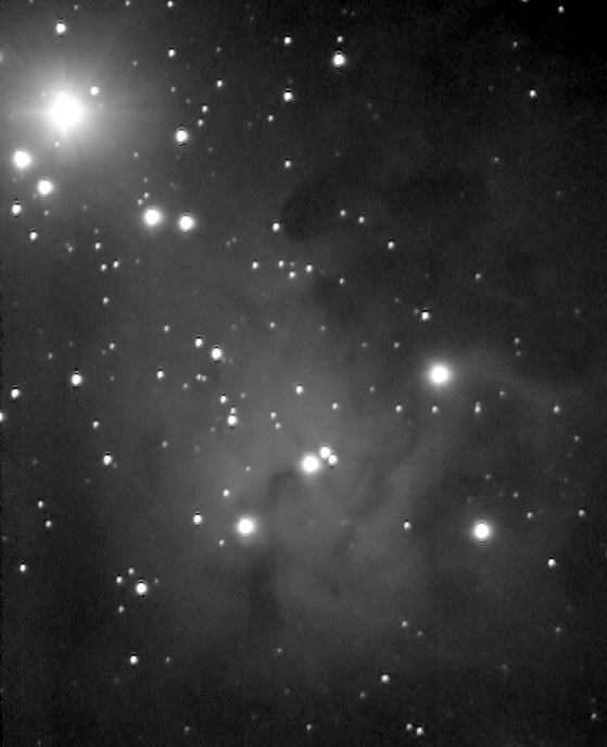 Bei NGC 2264 handelt es sich eingentlich um eine riesige Wasserstoffwolke, die durch den heißen Stern S Mon zum Leuchten angeregt wird. Bekannt ist außerdem die Dunkelwolke, die sich im Süden über einen Teil des Nebels schiebt und eine dunkle Bucht, den Konusnebel, bildet. In der Nähe von S Mon gibt es aber auch viel Staub, der das Licht von S Mon bläulich streut und so einen Reflexionsnebel bildet. Datum: 03.04.06, 21:55h MESZ Optik: f=1410 mm f/6,0 Nachführung: keine Gesamtbelichtungszeit: 31 min (Einzelbilder: 10 Sekunden) Kamera: Watec WAT 120-N