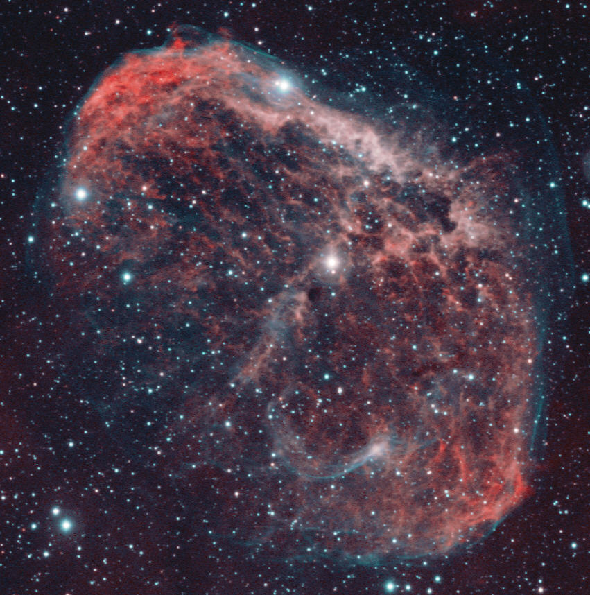 Da NGC 6888 vornehmlich in Hα und nur zu einem kleinen Teil in [OIII] strahlt, wollte ich eine Zweifarbenaufnahme des Nebels in diesen beiden Wellenlängen machen. Man kann sich den Unterschied in den Intensitäten verdeutlichen, wenn man die rot- und die blaugefilterte Aufnahme des POSS ansieht. Dem ionisierten Wasserstoff wurde in dieser Aufnahme die Farbe rot, dem ionisierten Sauerstoff die Farbe cyan zugeordnet, was bei den Nebeln ungefähr den realen Farben entspricht. Die Sterne erscheinen dagegen nicht in ihren richtigen Farben. Durch die kleinen Pixel der neuen Kamera kommen die filigranen Details trotz der moderaten Brennweite sehr schön heraus. Datum: 23.-25.07.12, 23:30h MESZ Optik: 750mm f/5,4 Nachführung: TVGuider mit Watec 120N an 90mm f/5,6 Belichtungszeit: 140 min Hα+140 min [OIII] (Einzelbilder 600s) Kamera: Atik 460EX Filter: 6nm Hα und 13nm [OIII] von Astronomik