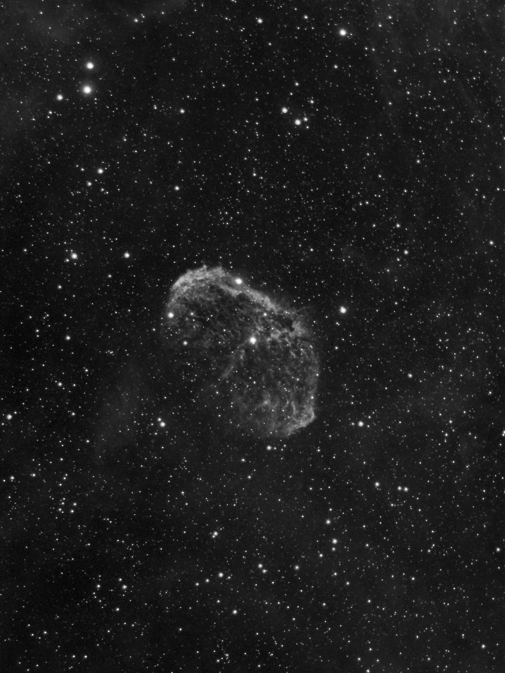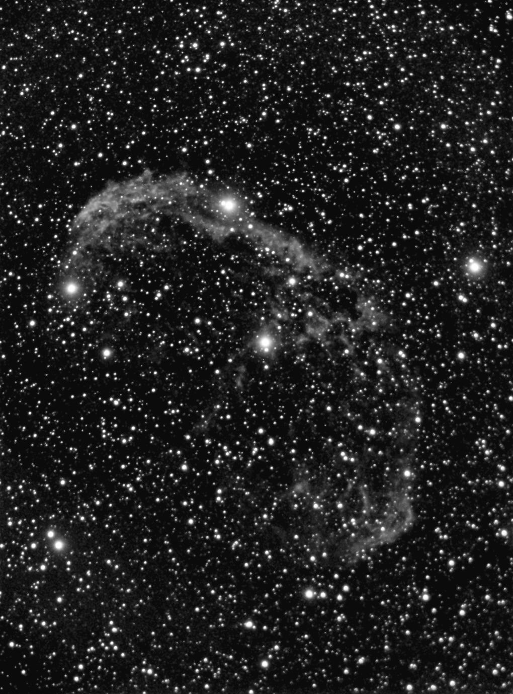 Da NGC 6888 vornehmlich in Hα und nur zu einem kleinen Teil in OIII strahlt, war klar, daß ich dieses Objekt mit der neuen Atik-Kamera, die wesentlich empfindlicher für Hα als die Watec ist, noch einmal aufnehmen mußte. Man kann sich den Unterschied verdeutlichen, wenn man die rot- und die blaugefilterte Aufnahme des POSS ansieht. Außerdem kommen durch die fast dreifache Brennweite gegenüber der untenstehenden Aufnahme viel mehr Details heraus. Datum: 16.08.09, 00:09h MESZ Optik: 1180mm f/5,0 Nachführung: TVGuider mit Watec 120N am C5 f/10 Belichtungszeit: 50 min (Einzelbilder 300s) Kamera: Atik 314L Filter: R aus Astronomik IIc RGB-Filtersatz