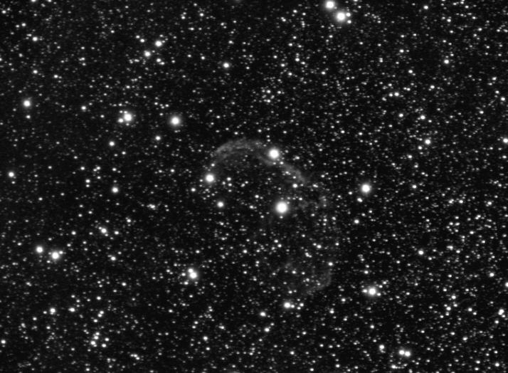 Der geliehene 100mm Refraktor war so lichtstark, daß der nördliche Bogen von NGC 6888 bereits auf dem Livebild klar erkennbar war. Wer Farfotos dieses bekannten Himmelsobjekts kennt, wird vielleicht etwas von meinem Ergebnis enttäuscht sein. Dabei ist aber zu berücksichtigen, daß NGC 6888 vornehmlich in Hα und nur zu einem kleinen Teil in [OIII] strahlt. Man kann sich den Unterschied verdeutlichen, wenn man die rot- und die blaugefilterte Aufnahme des POSS ansieht. Was ich hier sichtbar machen konnte, ist im Wesentlichen die [OIII]-Strahlung, für die die Watec wesentlich empfindlicher ist. Datum: 19.04.09, 04:16h MESZ Optik: f=400 mm f/4,0 Nachführung: keine Gesamtbelichtungszeit: 27 min (Einzelbilder: 10 Sekunden) Kamera: Watec WAT 120-N