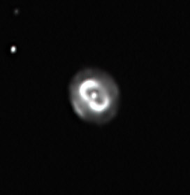 Mit einer Belichtungszeit von 5 Sekunden pro Einzelbild ist das Objekt eigentlich schon überbelichtet. Aber ich hatte Angst, daß die dunklere Nebelhülle bei einer Reduzierung der Belichtungszeit auf 2,5 Sekunden nicht mehr deutlich genug herauskommen würde. Der Einsatz eines OIII-Filters hätte nichts genützt, da ja nicht die Helligkeit des Zentralsterns, sondern die extreme Helligkeit des inneren Rings das Problem ist, die der OIII-Filter nicht abgeschwächt hätte. Datum: 05.09.05, 02:36h MESZ Optik: f=2350 mm f/10 Nachführung: keine Gesamtbelichtungszeit: 16 min (Einzelbilder: 5 Sekunden) Kamera: Watec WAT 120-N