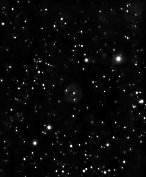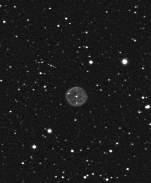 Der Planetarische Nebel PK 36 +17.1 oder Abell 43 ist zwar kein ganz winziger, aber dafür sehr lichtschwacher Vertreter seiner Gattung. Es war bei dieser Aufnahme sehr schwer, den Hintergrund gleichmäßig dunkel zu bekommen, aber die schwache Scheibe von Abell 43 nicht im Hintergrund untergehen zu lassen, da sie nur knapp heller als der Hintergrund war. In Anbetracht der hellen Sommernacht ist das Ergebnis für mich noch akzeptabel. (Ausschnitt) Datum: 10.06.08, 00:30h MESZ Optik: f=1410 mm f/6,0 Nachführung: keine Gesamtbelichtungszeit: 26 min (Einzelbilder: 10 Sekunden) Kamera: Watec WAT 120-N