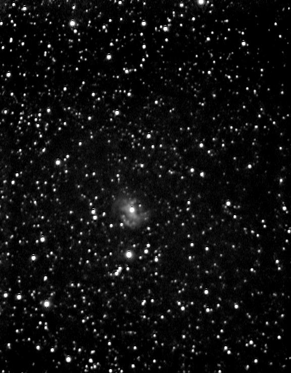 PK 50+ 3.1, auch Merrill's Star, Hen 2-427 oder M1-67 genannt, ist gar kein Planetarischer Nebel, obwohl er ursprünglich wegen seines Aussehens als solcher katalogisiert wurde. Es handelt sich in Wahrheit um die Gashülle um den Wolf-Rayet-Stern WR 124. Diese Sterne zählen zu den heißesten und massereichsten und blasen mit ihrem gewaltigen Sternwind riesige Mengen ihrer äußeren Atmosphäre in die Umgebung. Der Vergleich der Aufnahme mit farbgefilterten Aufnahmen des POSS zeigt, daß die nebenstehend sichtbaren Strukturen des Nebels vor allem rot leuchten. Auf den Aufnahmen im blauen Licht sind diese Strukturen nicht zu sehen, wie auch der ganze Nebel dort nur sehr schwer auszumachen ist. Da der Nebel insbesondere auf den rotempfindlichen Fotoplatten des POSS 1 sichtbar war, hatte Stewart Sharpless ihn in seinen Katalog der HII-Regionen aufgenommen, in dem er als Sh2-80 geführt wird. Datum: 13.09.05, 22:39h MESZ Optik: f=1480 mm f/6,3 Nachführung: keine Gesamtbelichtungszeit: 27 min (Einzelbilder: 10 Sekunden) Kamera: Watec WAT 120-N
