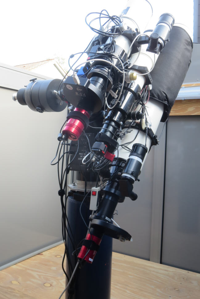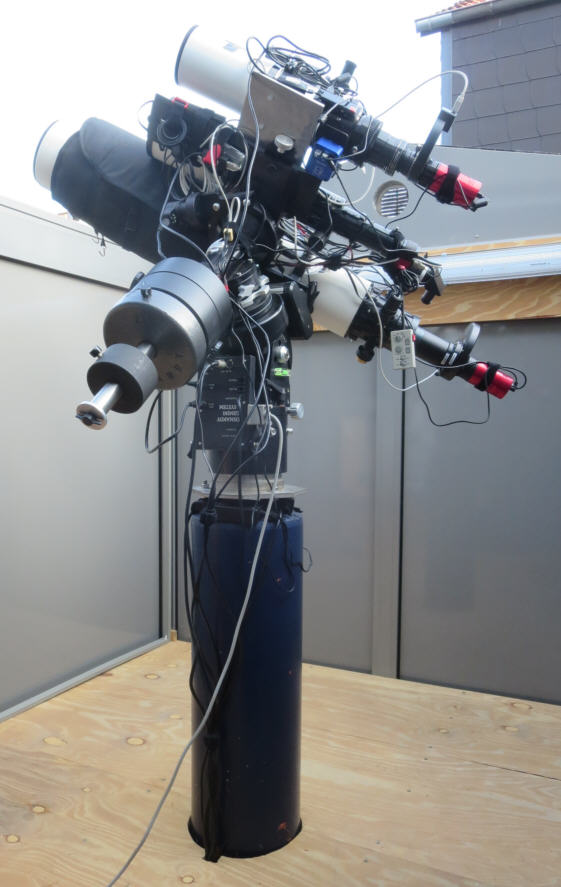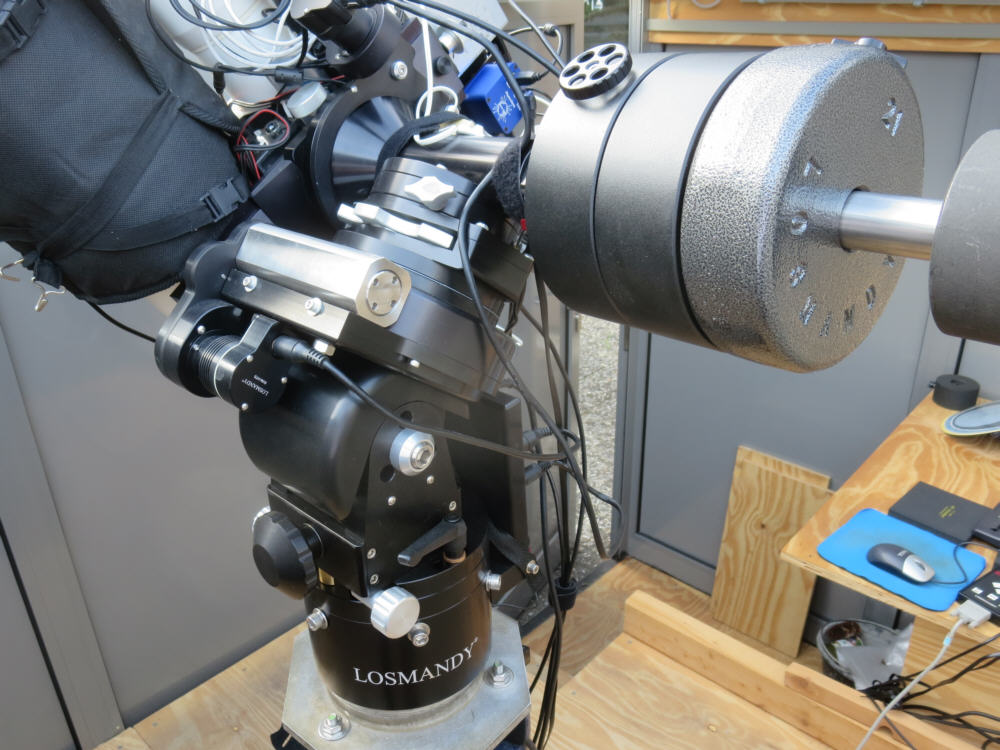 Alle Kabel zur Montierung und den Kameras, Fokussierern, Filterrädern, USB-Hubs etc. habe ich achsennah verlegt, so dass sie beim Schwenken nicht verhaken können und ihr Gewicht auch keine Zugkräfte auf Stecker oder die Deklinationsachse ausüben kann. Jedes der beiden kamerabestückten Teleskope hat sein eigenes USB-Kabel mit Verstärker, seinen eigenen USB-Hub und seine eigene 12V-Stromversorgung. Sollte etwas an einem Teleskop ausfallen, ist immer noch das andere voll einsatzfähig. Deshalb haben auch beide Teleskope ein über USB-Kabel ansteuerbares und mit Strom versorgtes Filterrad mit 7 bzw. 8 Filterplätzen bekommen, die mit LRGB-, Hα-, [OIII]- und IR-Passfiltern bestückt sind.