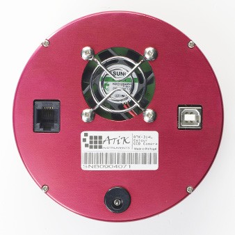 Schon recht bald kristallisierte sich der Sony CCD-Sensor ICX-285AL als derjenige heraus, der meine Wünsche am besten abbilden konnte. Nun galt es, eine Kamera mit diesem Chip und ein dazu passendes Filterrad zu finden, die auch die restlichen Wünsche erfüllten. Die Kamera fand ich in der Atik 314L und dem Atik USB-EFW Filterrad. Die Kamera kommt in einem flachen runden Aluminiumgehäuse von 110mm Durchmesser und weist teleskopseitig einen T2-Anschluß und auf der Rückseite einen Ventilator, eine USB-Schnittstelle, den 12V-Stromanschluß und einen ST4-kompatiblen Anschluß für einen Autoguider auf. Sie wiegt nur 400g und benötigt einen Strom von max. 0,8A bei 12V Spannung.