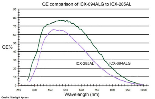 Während der 3 Jahre, die ich Astrofotografie mit der gekühlten CCD-Kamera Atik 314L betrieb, hatte ich häufiger den Gedanken, daß es doch schön wäre, wenn Sony einen größeren CCD-Chip als den 9 x 6,7mm großen ICX-285AL herausbringen würde. Gerade bei der Fotografie großer Emissionsnebel oder Galaxienhaufen wünschte ich mir manchmal mehr Chipfläche. Und dann las ich Anfang 2012 davon, daß Sony in der Tat mit dem ICX-694ALG einen flächenmäßig doppelt so großen CCD-Chip mit 6 Millionen aber nur 4,54 x 4,54µm kleinen Pixeln herausgebracht hatte. Und die sollten auch noch eine erheblich höhere Quanteneffizienz als der ICX-285AL haben. Kleinere Pixel heißt ja, daß bei gleicher Quanteneffizienz weniger Signal pro Pixel und Zeiteinheit bei der Fotografie flächiger Objekte aufgezeichnet wird. Insofern war ich zunächst etwas skeptisch, hatte dann aber einen Vergleich der spektralen Empfindlichkeiten von ICX-285AL und ICX-694ALG gefunden, der andeutete, daß der Empfindlichkeitsgewinn des ICX-694ALG den Größennachteil in den Pixeln etwa kompensieren könnte.