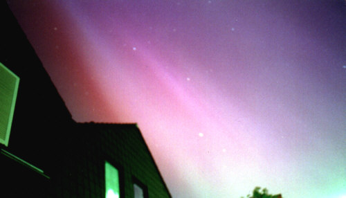 Ich hatte bereits am 5./6. April dieses Jahres mein erstes Nordlicht gesehen. Damals habe ich es nur auf mich einwirken lassen und nicht fotografiert. Die Mitteilung, daß Nordlichter zu sehen waren, kam über e-Mail, als das Schauspiel bereits im Gange war. Deswegen war zum Aufbauen der fotografischen Ausrüstung auch keine Zeit. Außerdem fand damals das Hauptspektakel erst weit nach Mitternacht statt, als ich schon ins Bett gegangen war. In der Nacht vom 15. auf den 16. Juli 2000 war es anders. Bereits zwei Tage zuvor trudelten die Nordlicht-"Warnungen" per e-Mail ein. Den ganzen Abend stand ich am Fenster und schaute nach draußen. Der Himmel war bewölkt, klarte aber mit zunehmender Zeit auf. Diesmal stand auch das Fotostativ mit geladener Kamera bereit. Um Mitternacht waren endlich Aufhellungen am Himmel zu sehen. Zu diesem Zeitpunkt war der gesamte Nordhimmel vom Westen bis zum Osten und über den Zenith wolkenlos. Das Schauspiel begann mit einer Strahlenkrone. Helle Streifen, sogenannte Streamer, richteten ihre Leuchtfinger vom Horizont in die Höhe, um sich im Zenith zu vereinigen. Davor in nördlicher Richtung schwebte zeitweilig ein grüner gewellter Saum. Danach leuchtete es vor allem im Westen und Nordwesten rot und violett. Im Nordwesten stand der Große Wagen. In ihm erschienen immer wieder Streamer, ohne daß sich die Strahlenkrone aber wieder ausbildete. Gegen 00.40h hatte es dann aber ein Ende, und ich ging zufrieden schlafen. |