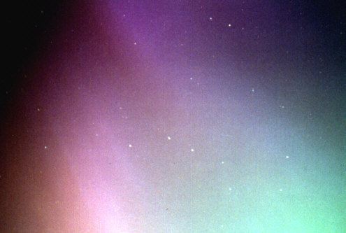 Datum: 16.07.00, 00.00h-00.30h MESZ Optik: 28 mm, f/2,8 Nachführung: keine Belichtungszeit: 30 sec Film: Kodak Royal Gold 100 Leider habe ich in der Eile nicht fokussiert. Dadurch sind die Sterne dicke Punkte, aber die Streamer, die sich im Zenith in der Nähe von Wega zu einer Strahlenkrone vereinigten, sind trotzdem sehr schön zu sehen. |