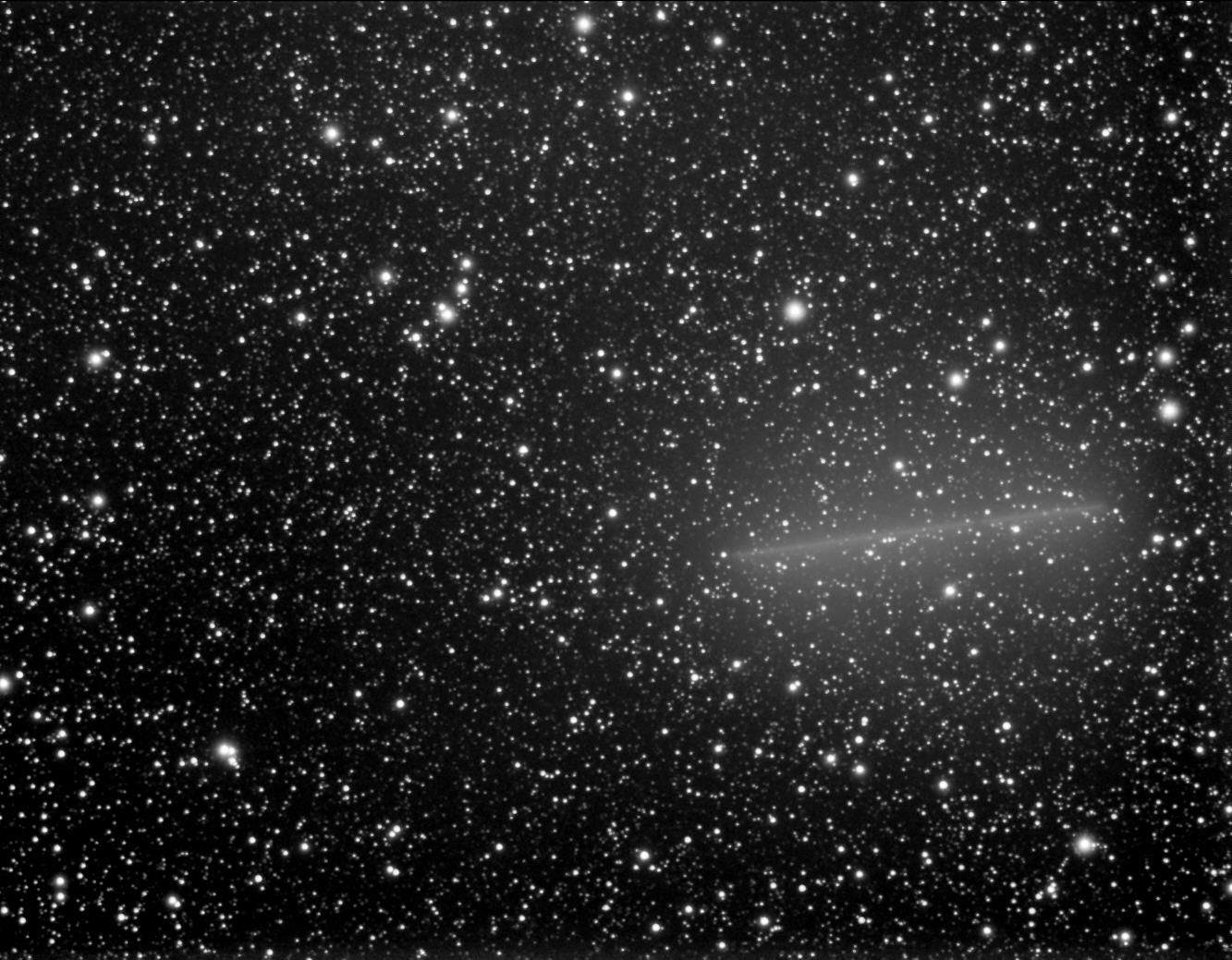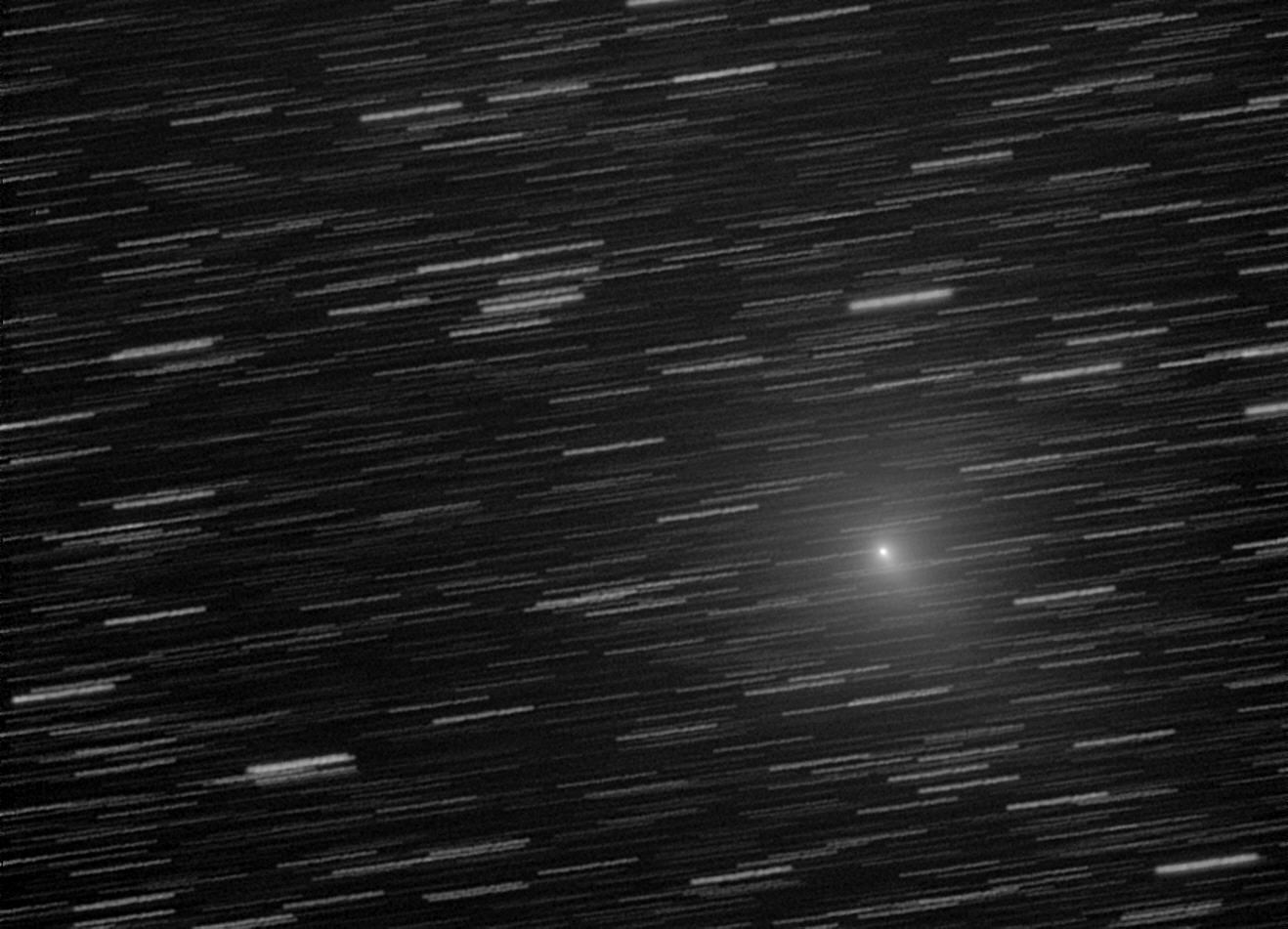 Die letzten 45 Minuten der Aufnahmen habe ich auf den Kometen zentriert gestackt. Die Sterne erscheinen jetzt natürlich als Strichspuren. Dafür kommt nun der kurze, nach rechts unten gerichtete Kometenschweif schön heraus. Die Koma wirkt aber etwas kleiner als auf dem obersten Bild. Datum: 09.10.10, 03:14h MESZ Optik: f=500 mm f/5,6 Nachführung: ohne Gesamtbelichtungszeit: 45 min (Einzelbilder: 60 Sekunden) Kamera: Atik 314L