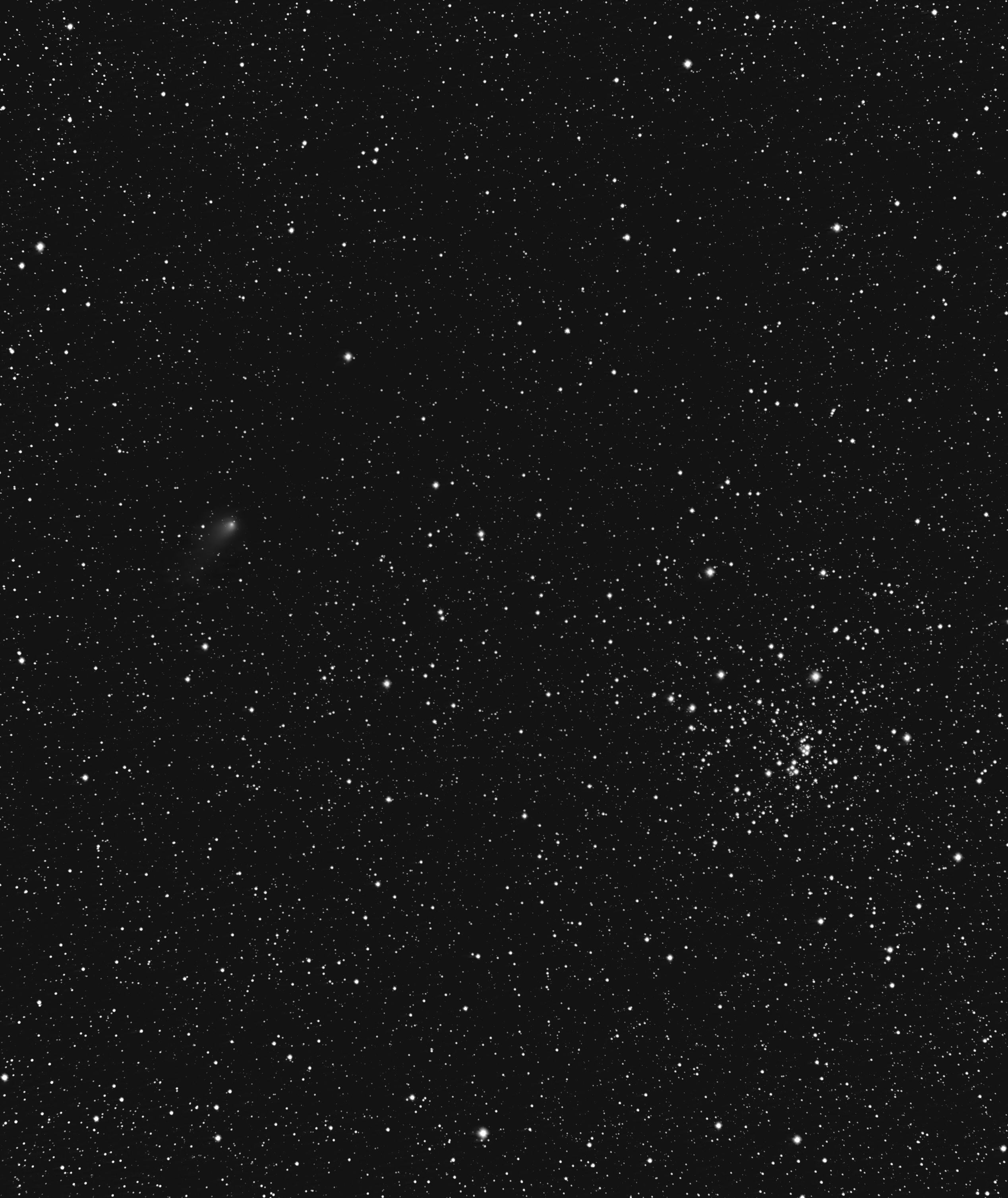 Der relativ helle Komet C/2017 T2 (PANSTARRS) bewegte sich Anfang 2020 langsam durch das Sternbild Perseus und lief dabei Ende Januar knapp nördlich an den beiden offenen Sternhaufen NGC 869 und NGC 884 (h und χ Per) vorbei. Ein paar Tage zuvor riss die dichte Wolkendecke auf, und es verschleierten nur dünne Wolken bzw. Hochnebel den Sternenhimmel, dessen hellsten Sterne sichtbar waren. Da für die nächsten Tage kein besseres Wetter angekündigt war, machte ich eine Aufnahme des Kometen, solange die Wolkenlücke hielt. Allerdings befand sich der Komet C/2017 T2 noch etwas von den Sternhaufen entfernt, so dass nur der östlichere χ Per mit ins Bildfeld passte .