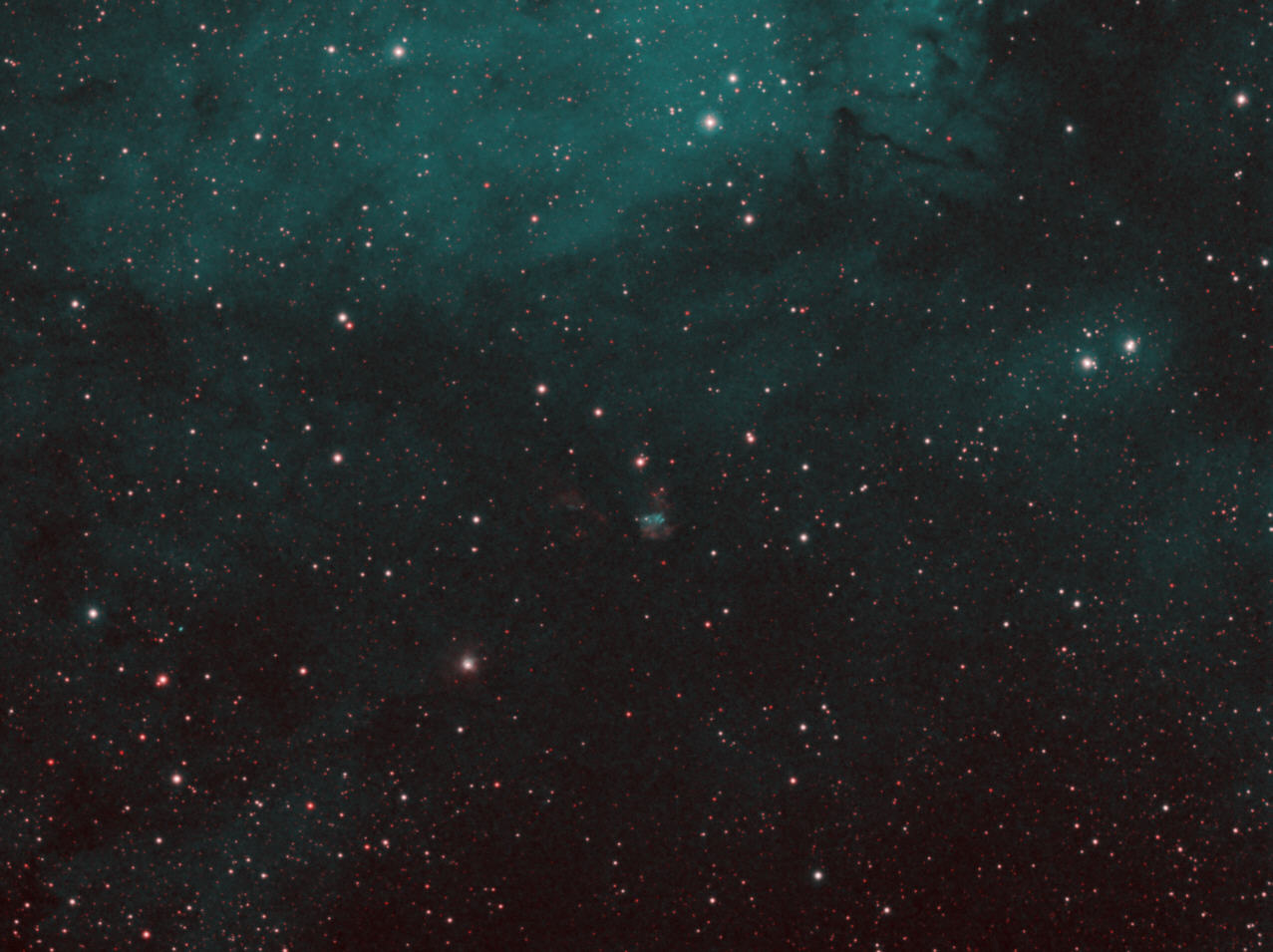 Die beiden Aufnahmen durch den IR-Passfilter und durch den Hα-Filter habe ich zu einem Falschfarbenbild kombiniert. Die Aufnahme durch den Hα-Filter habe ich in die Blau- und Grün-Kanäle, die IR-Aufnahme in den Rot-Kanal geschoben. Dadurch erscheint die Emission des Wasserstoffs etwas ungewohnt in türkiser Farbe. Der Planetarische Nebel PM 1-339 sticht östlich von Cep A deutlich als zwei eng beieinanderliegende türkise Punkte heraus. Datum: 30.08.22, 22:23h MESZ und 03.09.22, 00:30h MESZ Optik: f=750mm f/5,4 Nachführung: TVGuider mit Watec 120N an 90mm f/5,6 Gesamtbelichtungszeit: Hα = 60 min, IR = 100 min (Einzelbilder: 240 Sekunden) Kamera: Atik 460EX Filter: 6 nm Hα und ProPlanet 807 IR-Pass von Astronomik