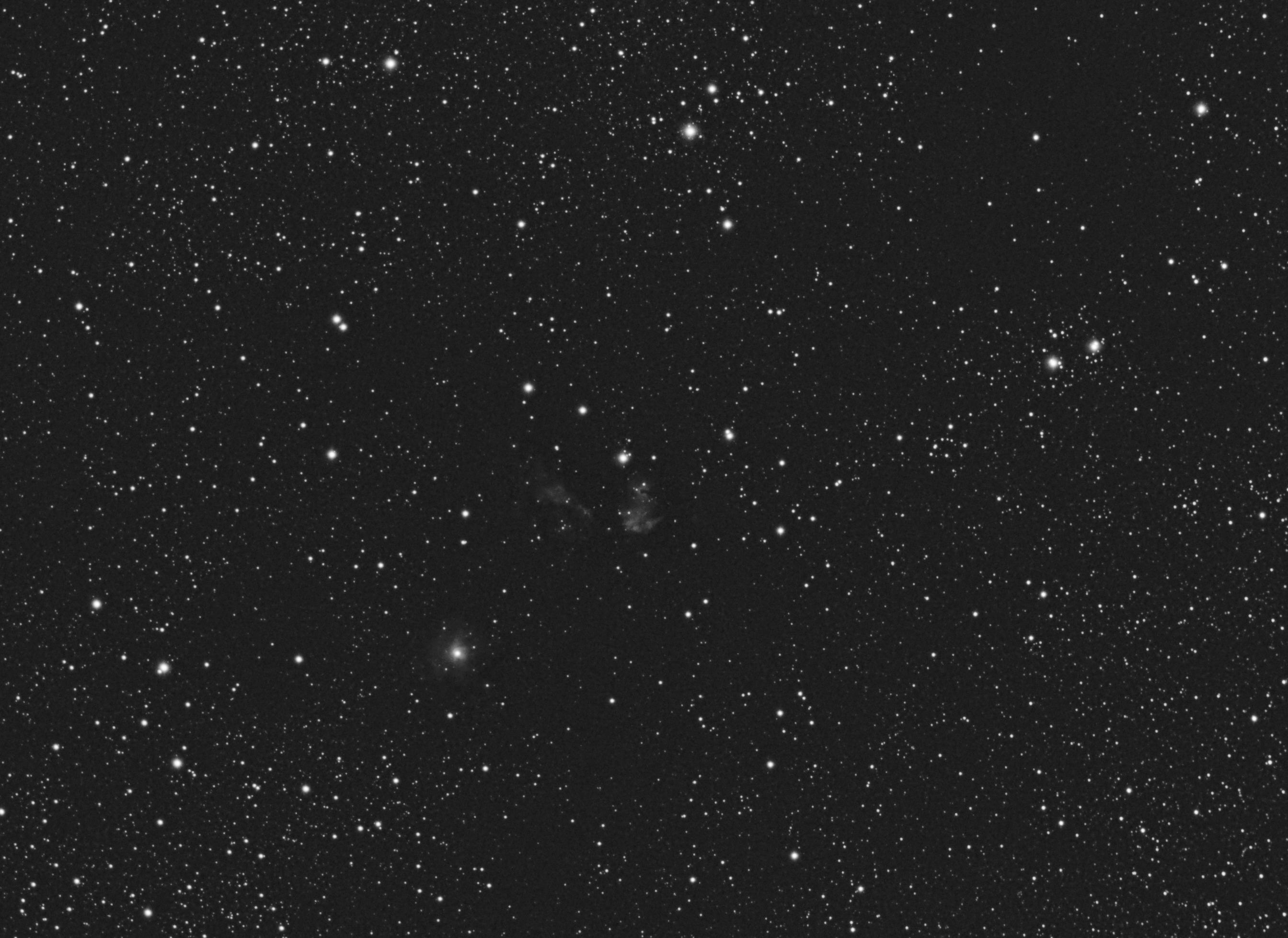 Auch in 2022 hat sich der im Infraroten helle variable Reflexionsnebel (in Bildmitte) noch nicht gegenüber dem Vorjahr verändert. Das Bild ist ein Ausschnitt aus dem gesamten Bildfeld. Dieses Jahr ist der winzige Planetarische Nebel PM 1-339 (auch PN G110.1+01.9 bzw. PK 110+01.1 genannt) östlich des Reflexionsnebels GN 22.55.2 wieder mit im Bildfeld. Allerdings ist er nicht ganz so gut aufgelöst wie auf der letztjährigen Aufnahme. Datum: 30.08.22, 22:23h MESZ Optik: f=750mm f/5,4 Nachführung: TVGuider mit Watec 120N an 90mm f/5,6 Gesamtbelichtungszeit: 100 min (Einzelbilder: 240 Sekunden) Kamera: Atik 460EX Filter: ProPlanet 807 IR-Pass von Astronomik