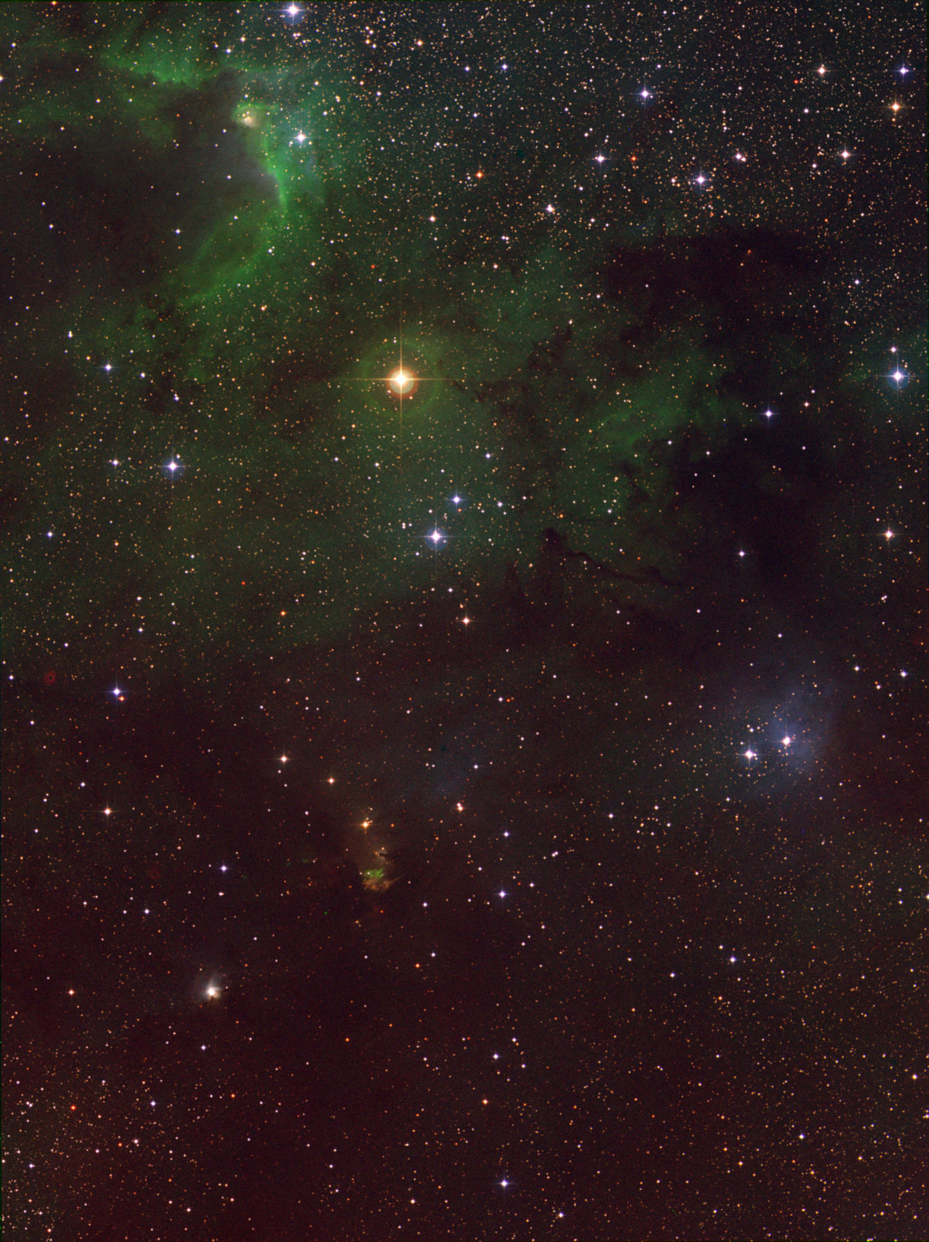 Die obige Aufnahme ist eine Falschfarbenaufnahme basierend auf einer Aufnahme im Nahinfraroten. Zur IR-Aufnahme habe ich noch je eine Aufnahme durch den Rot- und den Blau-Filter gemacht und diese zu einem IR-R-B-Komposit vereinigt. Dasselbe konnte ich auch mit den IR-, R- und B-gefilterten Aufnahmen aus dem POSS II machen (rechtes Bild). Das erlaubt mir auch den Vergleich meiner Aufnahme zu den POSS II-Aufnahmen aus den 90er Jahren (1989 (B), 1991 (R) und 1993 (IR)). Das Ganze ist jetzt eine Falschfarbenaufnahme, bei der die Wasserstoffemissionsnebel grün leuchten. Die Infrarotanteile leuchten rötlich bis rot. Gegenüber der Farbaufnahme aus 2012 wurde der Bildausschnitt etwas nach Osten verlegt, um die Nebelregion Cepheus A mit den jungen stellaren Objekten (YSO) mehr ins Zentrum zu rücken.