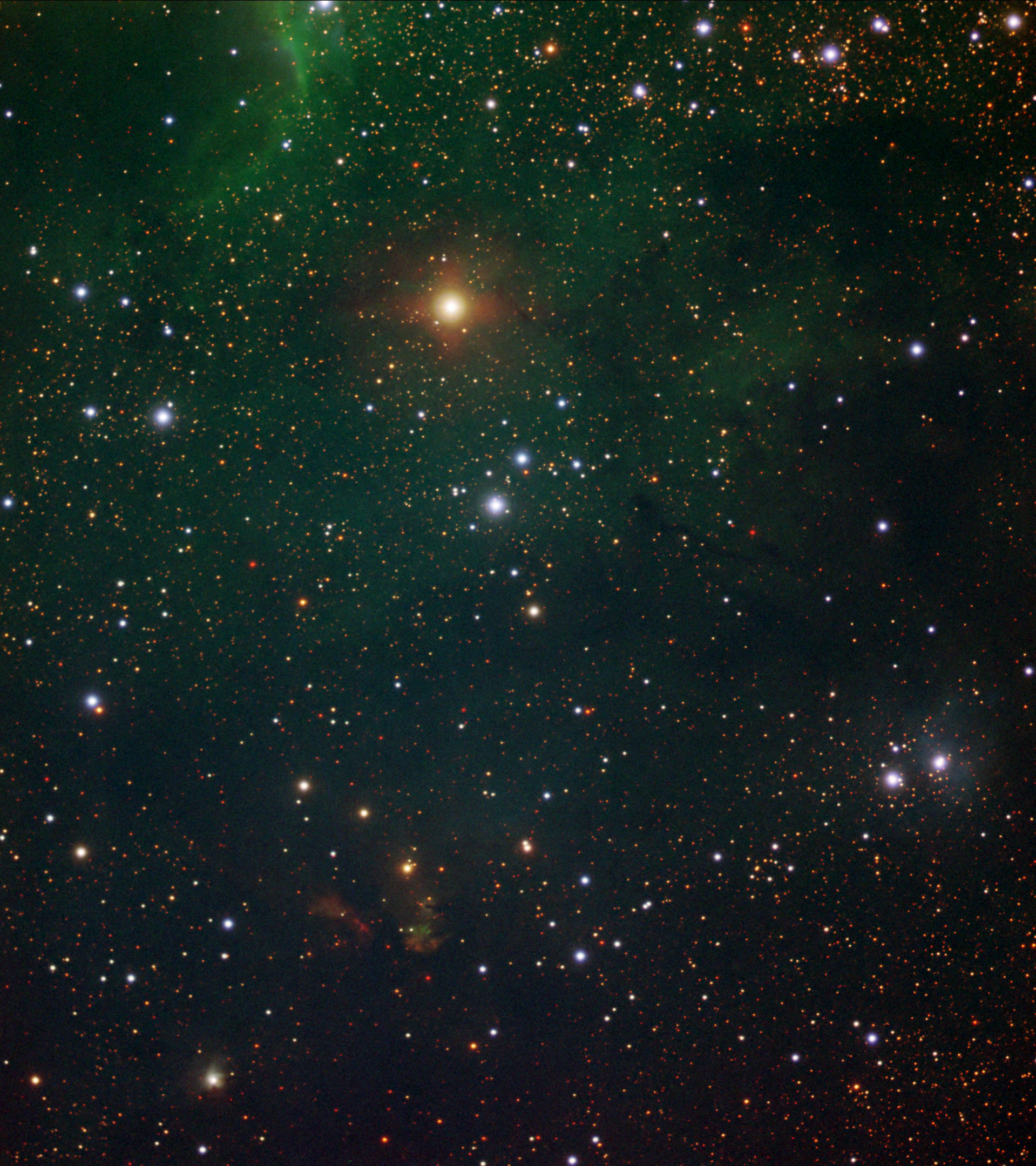 Interessant ist der hohe Anteil an roten Sternen. Diese sind nicht nur in den Staubmassen, sondern auch abseits davon zu finden. Im Staub selbst sind nur vereinzelt Sterne zu sehen, an seinem Rand dagegen recht viele. Die meisten roten Sterne des obigen Bilds sind in der Farbaufnahme aus 2012 nicht sichtbar, nur einige der IR-hellen roten Sterne deuten sich auf der Farbaufnahme an. So gesehen ist der IR-Pass-Filter ein voller Erfolg.