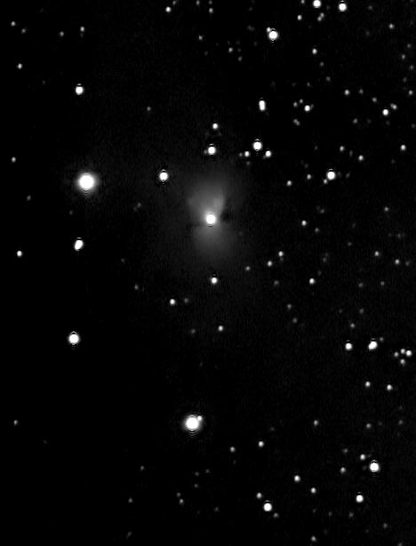 NGC 2163 ist ein bipolarer Nebell im Ostteil des Sternbilds Orion. Es handelt sich nicht etwa um einen Planetarischen Nebel, sondern um einen Reflexionsnebel, in dessem Zentrum ein sogenannter Be-Stern steht. Das sind sehr heiße Sterne vom Spektraltyp B, deren ultraviolette Strahlung ausreicht, Gasmassen in ihrer Umgebung zu ionisieren und zum Leuchten anzuregen. Aber das ist hier nicht der Fall. Üblicherweise findet man in den Spektren von Sternen nur Absorptionslinien derjenigen chemischen Elemente, aus denen der Stern besteht. In seltenen Fällen findet man jedoch auch Emissionslinien, d.h. bei bestimmten Wellenlängen ist die Intensität höher als die, die vom Stern kommt. Dieser Überschuß rührt von einer Gashülle um den heißen Stern, die von ihm ionisiert wird. Sie ist nicht auf dem Bild zu sehen und nicht zu verwechseln mit dem im Bild sichtbaren Reflexionsnebel. (Ausschnitt) Datum: 23.01.06, 23:19h MEZ Optik: f=1410 mm f/6,0 Nachführung: keine Gesamtbelichtungszeit: 23 min (Einzelbilder: 10 Sekunden) Kamera: Watec WAT 120-N
