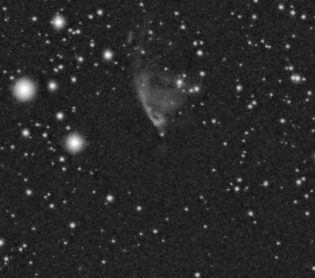 ![]() 2021 Auf meiner diesjährigen Aufnahme ist noch weniger vom Nebel zu erkennen als in 2020. Dafür leuchtet der junge Stern wesentlich stärker als noch ein Jahr zuvor. Erst nach starker Kontrastanhebung konnte man etwas Nebliges erkennen. Auch der Gegenkegel ist wieder sichtbar. Leider war die Transparenz an diesem Abend nicht optimal, so dass der Nebel nicht deutlicher herausgearbeitet werden konnte. Datum: 05.09.21, 23:24h MESZ Optik: f=750 mm f/5,4 Nachführung: TVGuider mit Watec 120N an 90 mm f/5,6 Gesamtbelichtungszeit: IR=100 min (Einzelbilder: 240 Sekunden) Kamera: Atik 460EX Filter: ProPlanet 807 IR-Pass von Astronomik