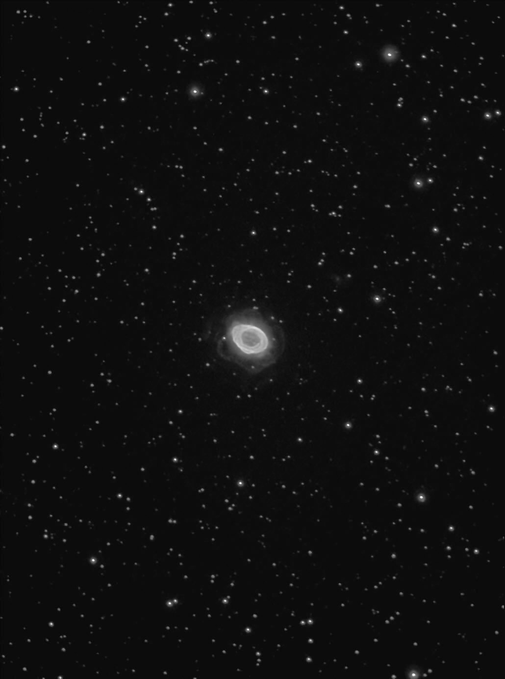 Nach über zwei Jahren habe ich M 57 wieder besucht und eine Aufnahme mit voller Brennweite gemacht. Um die Strukturen im Ring deutlicher heruaszuarbeiten, habe ich die Aufnahme nicht so sehr im Helligkeitsumfang gestreckt, dafür aber etwas mehr geschärft. (Ausschnitt) Datum: 13.09.06, 21:36h MESZ Optik: f=2350 mm f/10 Nachführung: keine Gesamtbelichtungszeit: 25 min (Einzelbilder: 10 Sekunden) Kamera: Watec WAT 120-N |