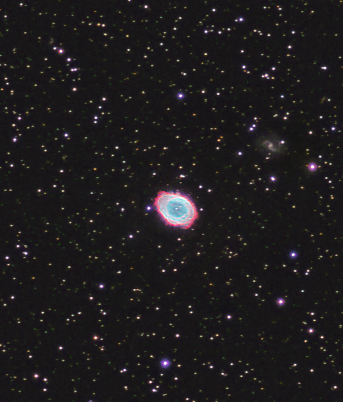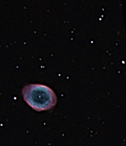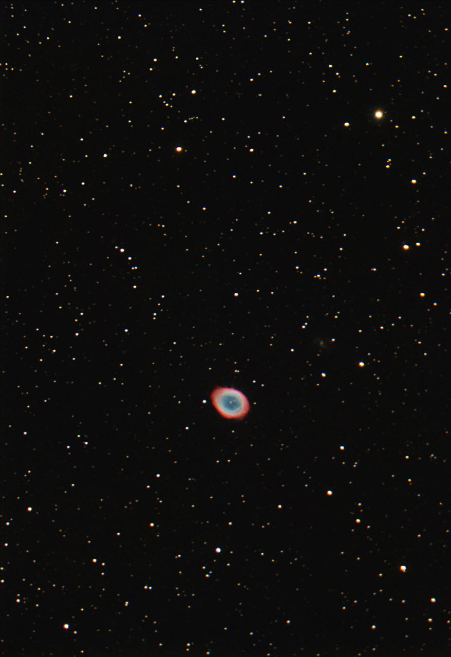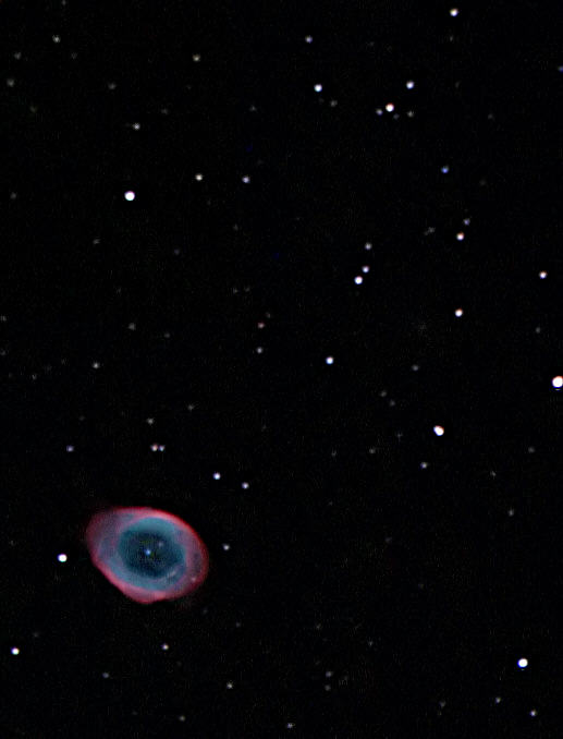 M 57 ist bekanntlich ein sehr heller und bunter Planetarischer Nebel. Deswegen wollte ich auch ihn einmal in Farbe ablichten. Oben ist ein echtes LRGB-Bild zu sehen, wobei die Schwarzweißaufnahme vom Vortag für den Luminanzkanal genommen wurde. Bei der zweiten Aufnahme wurde das untenstehende RGB-Bild mit der Schwarzweißaufnahme gemischt. Das Ergebnis ist nicht so schön wie die echte LRGB-Aufnahme. Die einzelnen Farbkanäle wurden nicht kontrastgesteigert! Als Farbfilter dienten bunte Glasfilter für die Planetenbeobachtung. Die Bandbreite der verwendeten Farbfilter ist größer als der von regulären RGB-Filtern für die CCD-Astrofotografie. Deswegen überlappen sie sich zum Teil deutlich. Der Blaufilter ist eigentlich ein Blaugrünfilter und der Grünfilter eher ein Gelbgrünfilter. Dafür ist der Rotfilter ein Rotorangefilter.