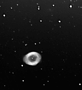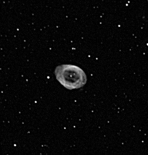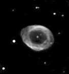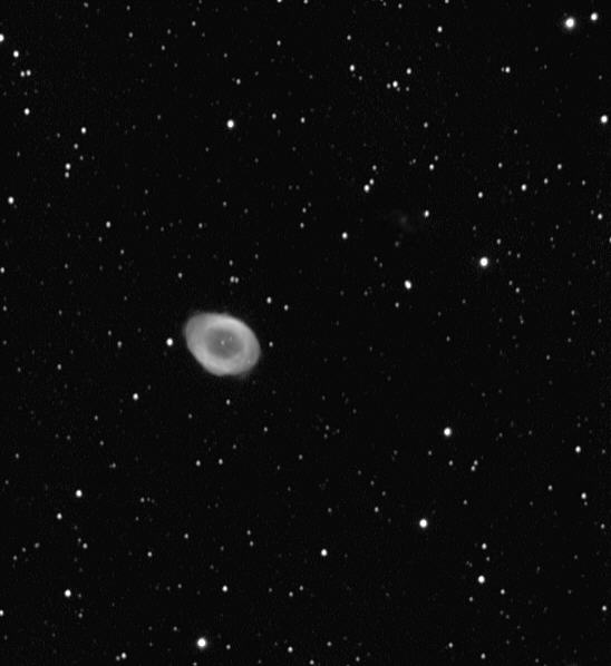Die nebenstehenden Bilder wurden mit einer anderen Kamera und kürzeren Belichtungszeiten gemacht. Erstaunlich ist, daß die Mintron den 14 mag hellen Zentralstern sehr deutlich, hell und sogar live auf dem Monitor zeigt. Ich bin auch ziemlich stolz darauf, daß es mir gelungen ist, Strukturen im Ring und im Innern des Rings herauszuarbeiten. Man darf alle Bilder dieser Seite ruhig vergrößern und mit Aufnahmen, die mit weit besserem Equipment gemacht wurden, vergleichen. (Ausschnitt) Datum: 14.09.03, 22.19h und 31.08.03, 00.10h MESZ Optik: f=1480 mm f/6,3 Nachführung: keine Gesamtbelichtungszeit: 15 und 12 min (Einzelbilder: 2,54 Sekunden) Kamera: Mintron 12V1C-EX Von der Spiralgalaxie IC 1296 (auf dem linken Bild schräg links unterhalb des Sterns am oberen Bildrand rechts von der Bildmitte) ist leider nur der Kern zu sehen. Die weit geschwungenen Spiralarme konnten leider nicht herausgearbeitet werden. Hierfür ist offenbar die längere Belichtungszeit der Watec notwendig.