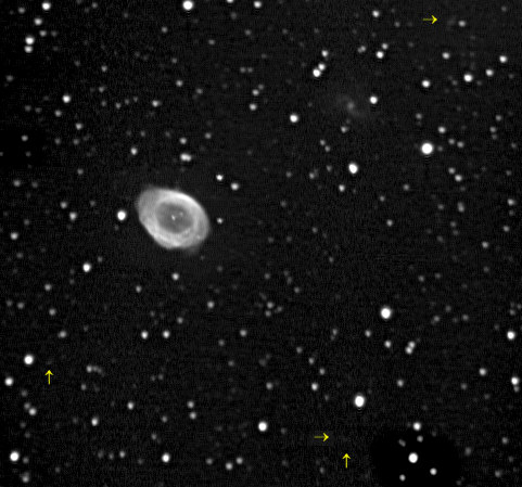 M 57 ist wohl der bekannteste Planetarische Nebel am Nordhimmel. Kaum ein Mensch ist nicht von dem zarten, einem Rauchring nicht unähnlichen Erscheinungsbild beim Blick durchs Teleskop angetan. In der Nähe befindet sich nicht nur die wie ein S geschwungene Spiralgalaxie IC 1296, sondern es konnten auf dieser Aufnahme auch noch drei schwache Hintergrundgalaxien abgebildet werden, auf die mit kleinen gelben Pfeilen verwiesen wird. Datum: 29.05.04, 00:50h MESZ Optik: f=1480 mm f/6,3 Nachführung: keine Gesamtbelichtungszeit: 30 min (Einzelbilder: 10 Sekunden) Kamera: Watec WAT 120-N |