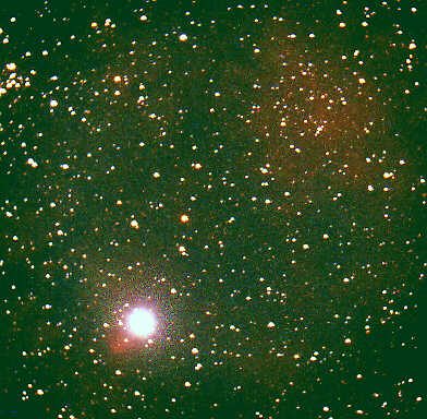 Im Schwan gibt es ja bekanntlich viele schöne HII-Regionen. Einige liegen rund um den Stern γ Cygni. Also einfach mit dem Teleskop auf γ Cygni gezielt, auf ihn nachgeführt (hätte man doch immer nur solche hellen Sterne zum Nachführen!) und belichtet. Auf dem Negativ kamen allerdings weniger HII-Regionen zum Vorschein als erwartet. Wieder mal war der Bildausschnitt für das C9 zu klein bzw. die Brennweite zu groß. Oben links ist der offene Sternhaufen NGC 6910 sichtbar, der etwa 40 Sterne enthält und eine visuelle Helligkeit von 6,7 mag hat. Datum: 05.09.99, 00.50h MEZ Optik: f=1480 mm f/6,3 Nachführung: manuell mit C5 bei V=278x Belichtungszeit: 30 min Film: Kodak Royal Gold 400 Bei dieser Aufnahme betaute die Korrektionsplatte bereits etwas. Die Sternbilder sind am Rand schon etwas diffus.
