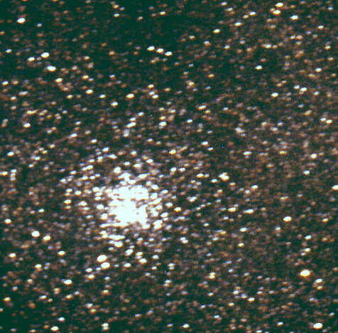M11 stand an diesem Abend bereits relativ tief und an einem recht aufgehellten Himmel. Das Zentrum ist offensichtlich überbelichtet, möglicherweise aber nur aufgrund der mangelhaften Nachführung verschmiert. Der Eindruck der großen Dichte dieses offenen Sternhaufens kommt aber gut heraus. (Ausschnittsvergrößerung) Datum: 04.09.99, 23.43h MEZ Optik: f=1480 mm f/6,3 Nachführung: manuell mit C5 bei V=139x Belichtungszeit: 30 min Film: Kodak Royal Gold 400 Die Vergrößerung von 139fach ist für mich beim Nachführen offenbar nicht hoch genug, da die Sterne deutlich länglich sind.