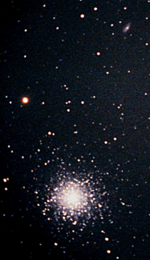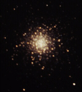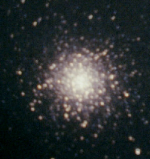 Überlagert man das dunklere mit einem helleren, kommt das nebenstehende Ergebnis heraus. Es fällt auf, daß die Abzüge nicht immer mit dem gleichen Vergrößerungsmaßstab erfolgen, so daß ich trotz des Versuchs der Größenanpassung beim Überlagern nie alle Sterne genau zur Deckung bringen kann. Wie man dieses Problem in Zusammenarbeit mit dem Fotolabor löst, weiß ich noch nicht. Auf jeden Fall ist das Komposit im Zentralbereich deutlich strukturreicher als der hellere Abzug, bei dem das Zentrum von M13 völlig ausgebrannt war. Dafür ist auf dem dunkleren Abzug z.B. NGC 6207 nicht mehr drauf |