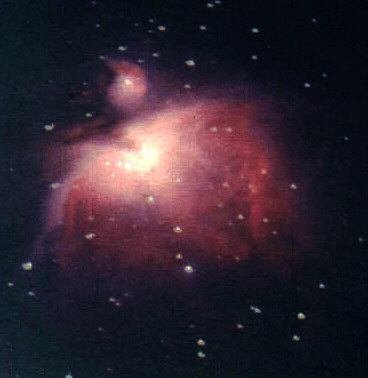 Komposit von einer kurz- und einer langbelichteten Aufnahme von M 42, digital kombiniert. Das Übereinanderpassen der Bilder sowie die Nachführung sind nicht ganz perfekt, wodurch eine zusätzliche Unschärfe hereinkommt. Dennoch ist der Zentralbereich deutlich strukturierter als auf der länger belichteten Aufnahme, auf der der Zentralbereich "ausgebrannt" ist. Auf der kürzer belichteten Aufnahme sind dagegen nur der Zentralbereich und einige hellere Sterne drauf. Deswegen wurden das Komposit anschließend noch ein wenig aufgehellt und die Farben geringfügig intensiviert. Datum: 04.01.97, 23.15h MEZ und 31.01.98, 23.15h MEZ Optik: f=1480 mm f/6,3 Nachführung: manuell mit Off-Axis Guider bei V=164x und mit C5 bei V=278x Belichtungszeit: 30 min und 5 min Film: Scotch Chrome 400 |