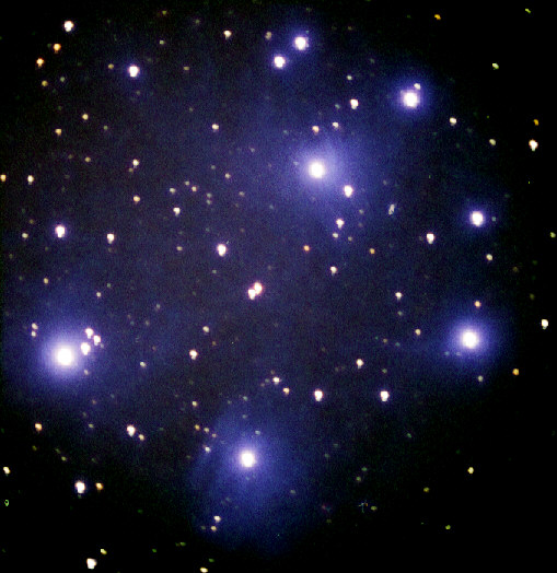 Erst Aufnahme von M45 durch mein C9. Nach 12 Minuten wanderte der Leitstern aus dem Fadenkreuz, was ich nicht sofort korrigierte, weil ich beim Nachführen nicht ständig durch das Okular sehe, sondern in Abständen von 10 bis 15 Sekunden kontrolliere, ob ich korrigieren muß. Trotzdem sind die Reflexionsnebel um einige der Sterne bereits in Ansätzen sichtbar! Datum: 12.02.99, 23.00h MEZ Optik: f=1480 mm f/6,3 Nachführung: manuell mit C5 bei V=278x Belichtungszeit: 12 min Film: Kodak PJM 2 (Ektapress Multispeed) Scan vom Negativ |