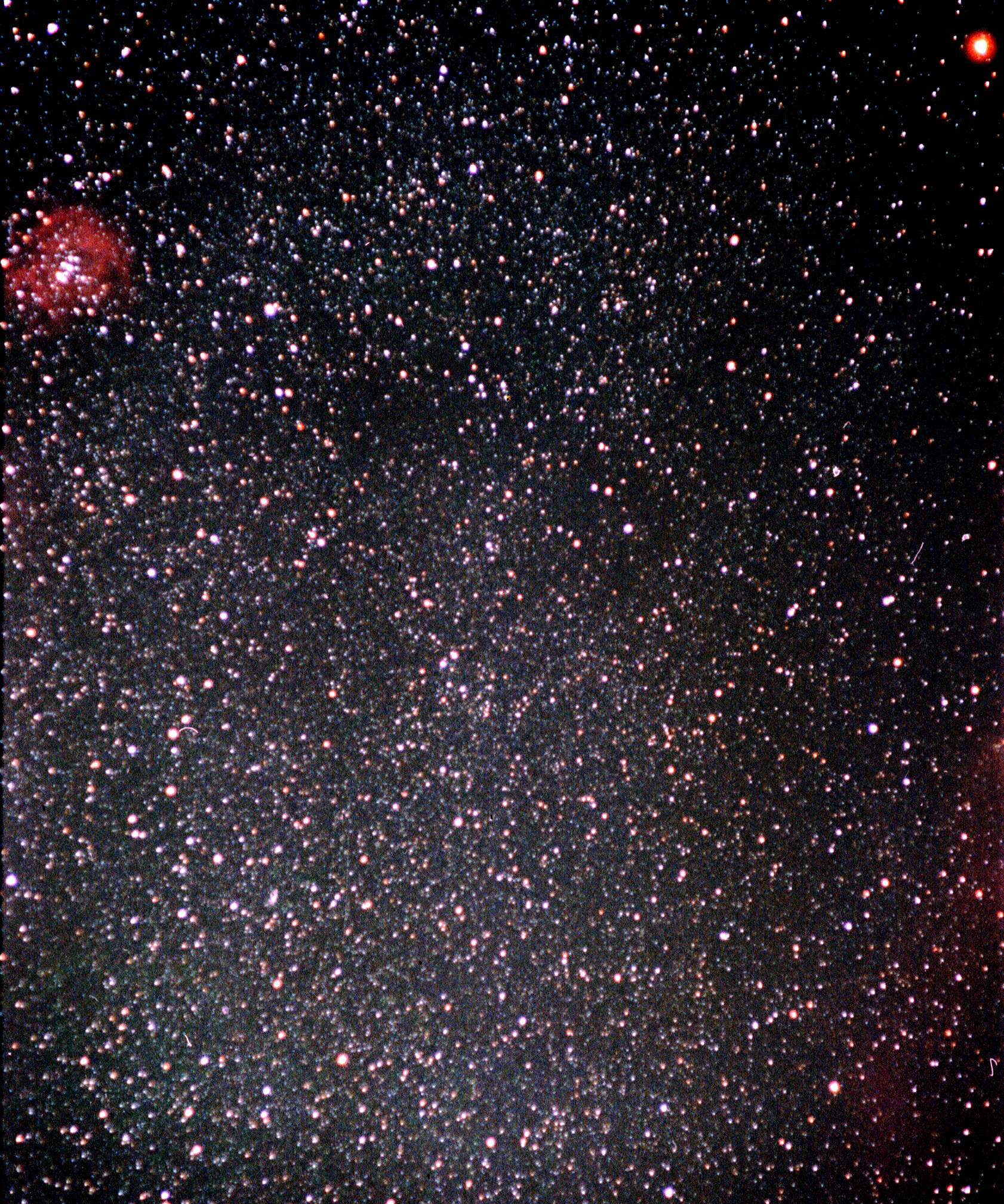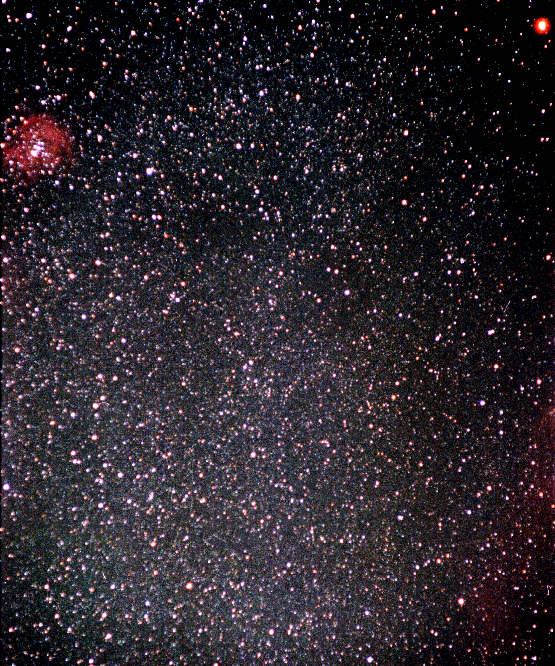 Datum: 16.02.02, 21.00h MEZ Optik: f=135 mm, abgeblendet auf f/2,8 Nachführung: huckepack auf CG-9, keine manuellen Korrekturen Belichtungszeit: 10 Minuten Film: Kodak Royal 400 Rechts oben strahlt Beteigeuze ins Bild. Links oben befindet sich der Rosettennebel NGC2237-9 mit dem in ihm eingebetteten offenen Sternhaufen NGC2244. Leider ist dieses schöne Objekt auf dem Foto ganz an den Rand gerutscht. Unten rechts ist als schwacher rötlicher Schimmer ein Teilbogen von Barnard's Loop zu sehen. Grenzgröße ca. 12,5 mag. In voller Auflösung (985 kB!)ist das Bild mit dem Sterngewimmel in der Milchstraße hier zu sehen.