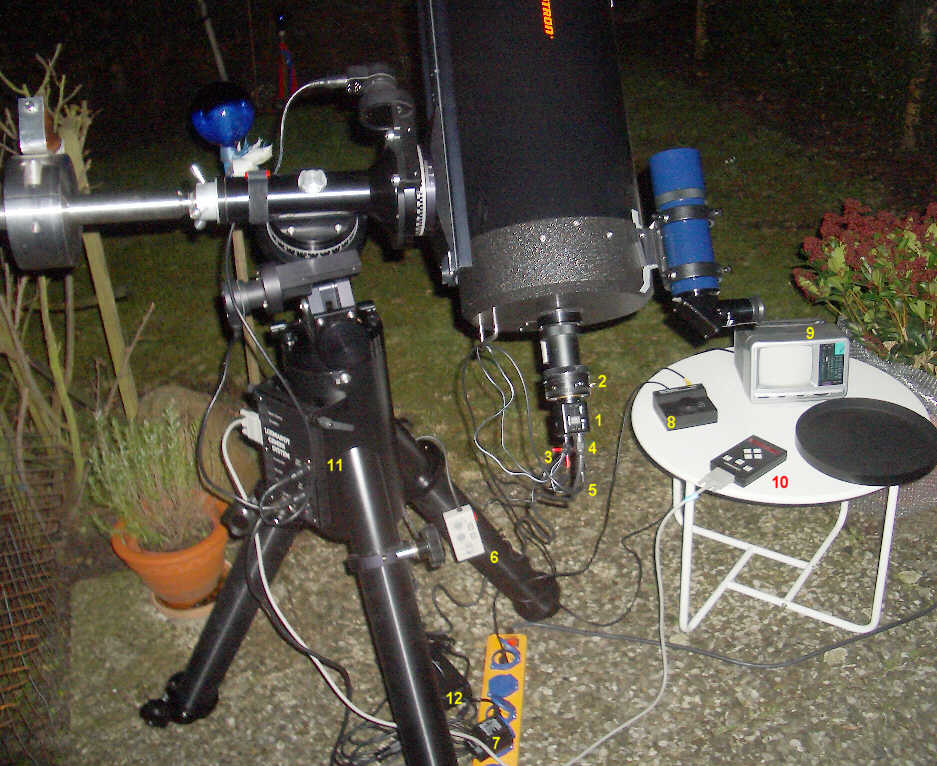 | CCTV-Kamera am Teleskop Auf dem obigen Bild ist das Teleskop praktisch fertig für die Fotografie des nächtlichen Himmels mit einer CCTV-Kamera. Die Ziffern im Bild kennzeichnen die verschiedenen Komponenten. Das Stativ wird so aufgestellt, daß die beiden zum Rasen zeigenden Beine entlang einer Fuge der Waschbetonplatten stehen. Die Fugen laufen exakt in Ost-West-Richtung. Mit Hilfe der eingebauten Libellen im Montierungskopf wird die Montierung dann noch waagerecht ausgerichtet. Azimuth und Polhöhe wurden einmal mittels einer Justierfunktion der Gemini-Software (Die GoTo-Ausführungen der Losmandy-Montierungen werden mit dem Programm Gemini betrieben.) eingestellt und werden nicht verändert. Dieses Aufstellungsverfahren ist selbst für langbrennweitige Aufnahmen mit der Watec ausreichend genau. Die Stabilität der Losmandy G11-Montierung und des Stativs ist legendär. Beide tragen mein Teleskop mit Leichtigkeit. Die Kabelführung der Kabel zur Kamera wirkt auf den ersten Blick etwas chaotisch und gefährdet, sich beim Schwenken des Teleskop irgendwo zu verhaken. In der Praxis ist das aber nicht der Fall. Die Kabel sind lang genug und werden durch den Haltegriff am Teleskoptubus weit genug von der Montierung ferngehalten. Das einzige Kabel, das beim Schwenken der Montierung zum Verhaken neigte, war das Kabel zum Deklinationsmotor. Es wird daher durch ein Klettband an der Deklinationsachse fixiert. Ein Verhaken ist jetzt nicht mehr möglich. Zur Fokussierung und zum Aufsuchen der Objekte wird ein kleiner Schwarzweißfernseher mit FBAS-Eingang benutzt. Der Fernseher kann wahlweise auch mit 1,5V-Batterien, einer 12V-Batterie oder einem 12V-Netzteil betrieben werden. Wenn das Videosignal der CCTV-Kamera parallel zum Framegrabber des PCs auch zum Fernseher geleitet wird, müssen sich beide Geräte das Signal teilen, und das am Framegrabber ankommende Signal ist abgeschwächt. Deswegen wird der Umschalter 8 benutzt. Der Umschalter läßt sich in zwei Betriebsarten einsetzen. In der im Bid dargestellten Betriebsart wird das Kamerasignal alternativ auf den Fernseher (über das Kabel mit den gelben Steckern angeschlossen) oder auf den Framegrabber (im Bild nicht dargestellt) geleitet. In einer weiteren Betriebsart ist es möglich, eine weitere CCTV-Kamera an einem kurzbrennweitigen Teleskop als Sucher einzusetzen. Dann werden die Videosignale beider Kameras alternativ auf den Fernseher geleitet. Dabei sind die Kamera an der Hauptoptik und der Framegrabber über einen Y-Stecker an den Umschalter angeschlossen. Das hat zwar den Nachteil, daß das Videosignal auf dem Fernseher bei der Zentrierung des Objekts auf dem Chip etwas leidet, schwächt aber das Signal zur Framegrabberkarte dennoch nicht ab, weil während der Aufnahme auf die Sucherkamera umgeschaltet wird. | |