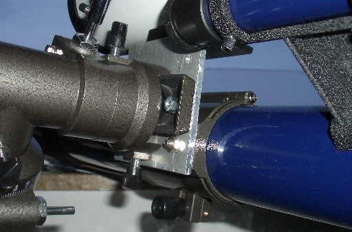 Vor einem guten Jahr hatte ich das "Lidl-Scope", einen Fraunhofer-Refraktor mit 70 mm Objektivdurchmesser und 700 mm Brennweite auf einer kleinen parallaktischen Montierung erstanden. Die Idee war, es als Reiseteleskop und für Fotografie mit der Kleinbildkamera und Normalobjektiv einzusetzen. Dafür sollte die parallaktische Montierung dem Anschein nach ausreichend stabil und genau sein. Nun steht die Beobachtung der totalem Sonnenfinsternis 2006 in der Türkei an. Der Refraktor soll mit. Die partielle Verfinsterung soll mit einer digitalen Sucherkamera per Okularprojektion fotografiert werden und die Totalität mit einer Kleinbildkamera und einem 500 mm Maksutov-Teleskop. Dafür mußte eine Vorrichtung her, um beide Optiken parallel anflanschen zu können.
