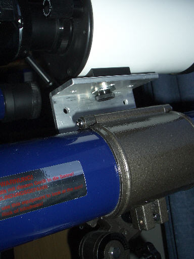 Ich hatte mir überlegt, daß ein einfacher ca. 5 mm dicker Aluminiumwinkel von etwa 100 mm Länge, dessen einer Schenkel ca. 100 mm und dessen anderer Schenkel ca. 50 mm lang ist, die simpelste Lösung sei. Also besorgte ich mir ein entsprechendes Strangpreßprofil vom Metallbauer und ließ mir die wichtigsten Löcher, die, bei denen es auf die Positionsgenauigkeit ankam, gleich mit anbringen. Die wichtigsten Löchter sind die für die Schrauben, mit denen der Refraktor genau parallel zur Kante des Winkels angeschraubt ist. Dadurch ist gewährleistet, daß weitere Optiken, die oberhalb des Refraktors auf den Winkel geschraubt werden, parallel zum Refraktor ausgerichtet sind. Die Schrauben sieht man auf dem untersten Foto unterhalb der Schwalbenschwanzschiene. Zum Glück haben die Hersteller des Refraktors metrische M6 Schrauben verwendet. Außerdem haben sie in die Rohrschelle, die den Refraktor hält Langlöcher gemacht, so daß der Abstand der Schrauben zwischen 75 mm und 65 mm variiert werden kann.