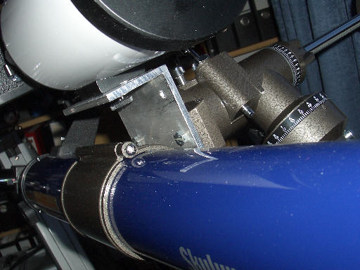 in den kurzen Schenkel des Winkelprofils habe ich einige Löcher mit 6,5 mm Durchmesser für ¼"-Fotogewindeschrauben gebohrt. Im Bild wird mein 500 mm Maksutov-Teleskop mit einer Rändelschraube gehalten. Trotz nur einer einzigen Schraube sitzt es sehr fest auf dem Winkel und verdreht sich nicht unter seinem Eigengewicht oder wenn man dagegen stößt. Außerdem hatte ich Befestigungslöcher vorgesehen, um mein C5 anschrauben zu können. Das hat sich dann aber als unmöglich erwiesen, weil es zu ausladend ist und mit den Feinbewegungswellen kollidiert. Kleinbildkameras und Fotoobjektive mit eigenem Stativgewinde lassen sich aber prima befestigen.