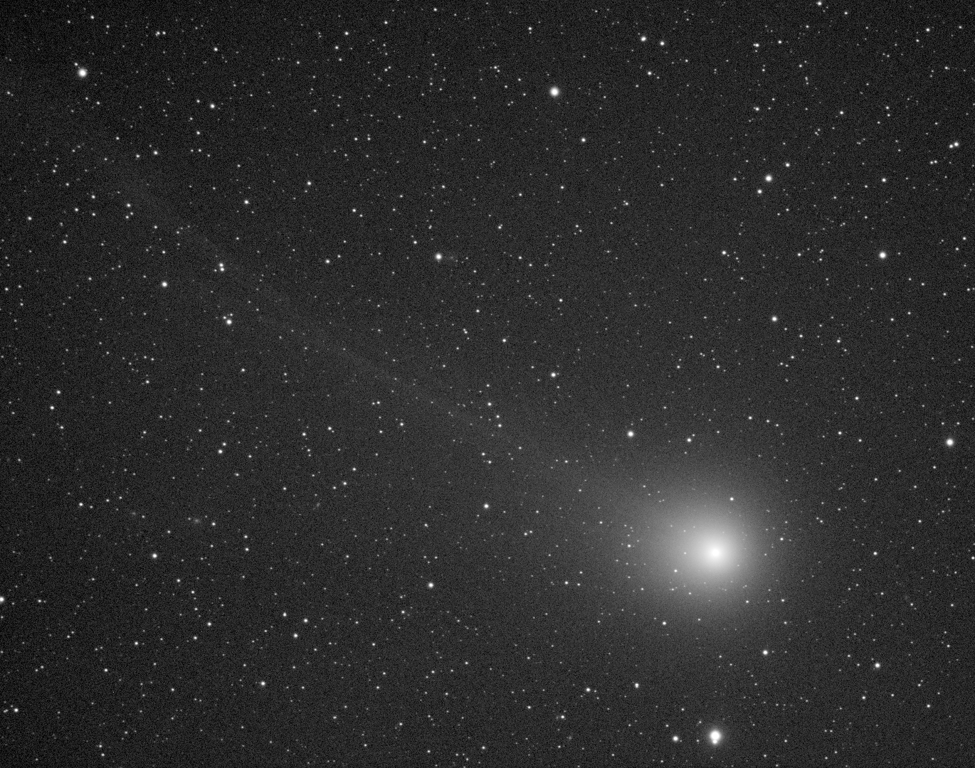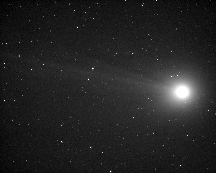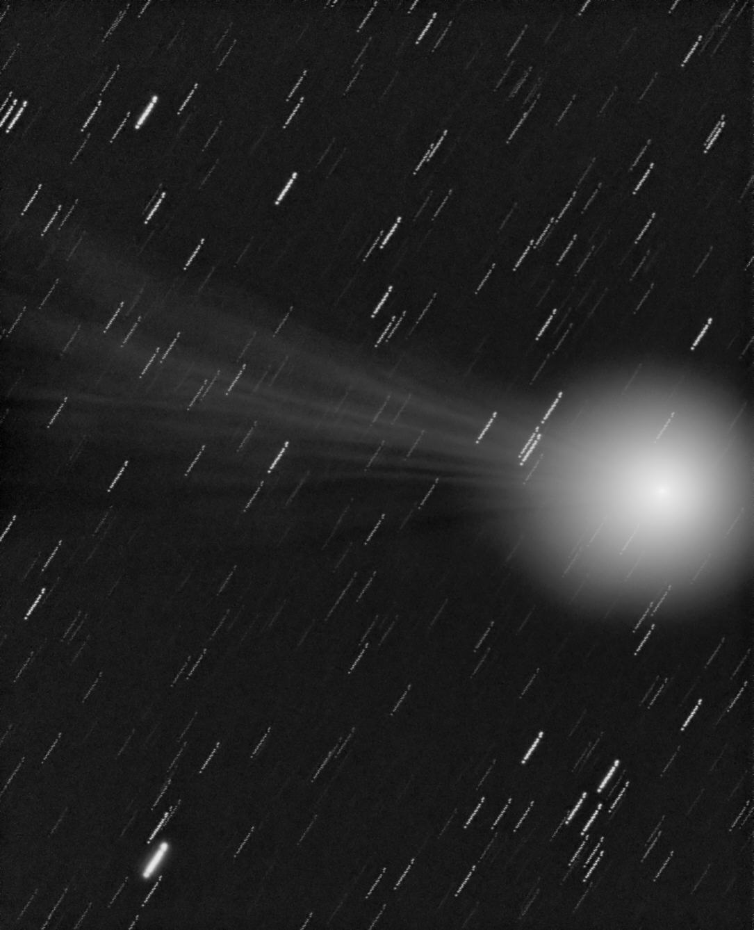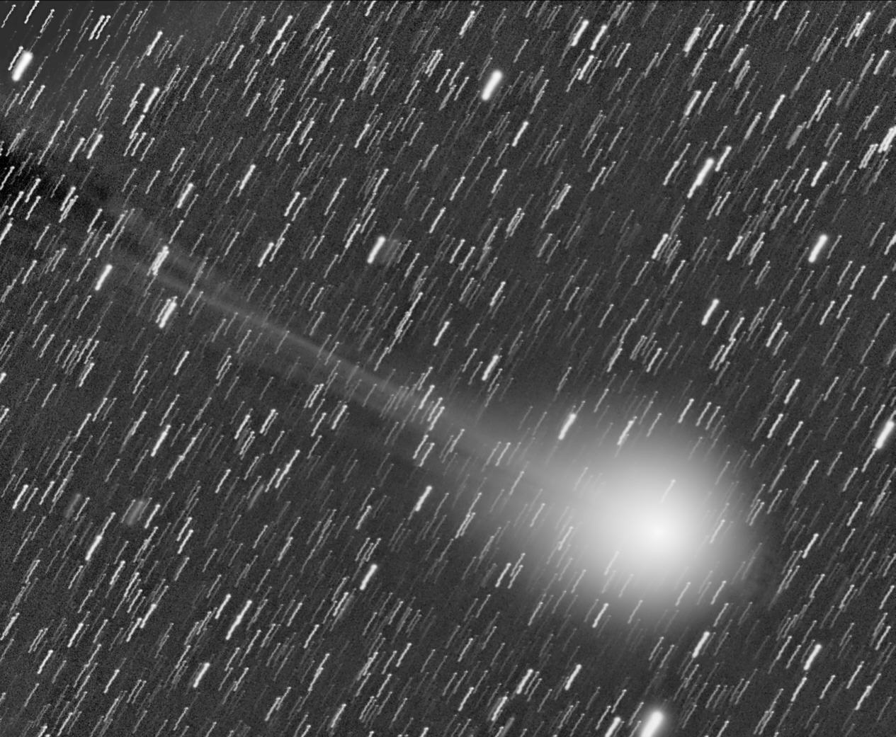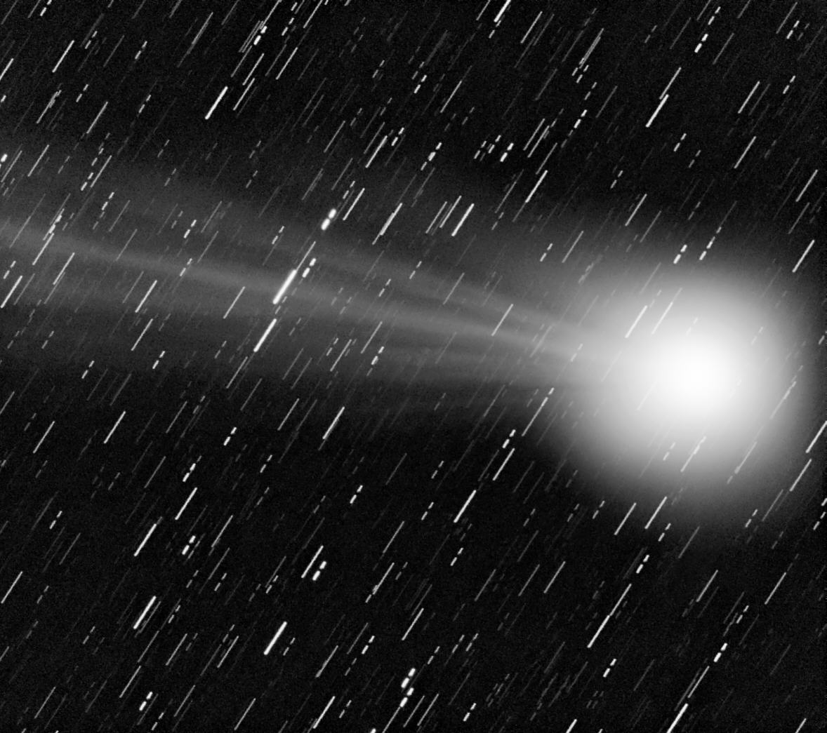 Das obige Bild ist auf den Kometenkopf zentriert. Dadurch werden die Sterne zu Strichspuren auseinandergezogen. Der Schweif erstreckt sich in östliche Richtung Die Bewegungen in ihm sind möglicherweise durch die lange Belichtungszeit etwas verwischt. Seine gewaltige Länge ist in dieser Darstellung allerdings nicht zu erkennen. Die Einzelbilder wurden etwas im Kontrast angehoben, damit sich der Schweif vom Untergrund abhebt. Dadurch ist der Kern überbelichtet. Das Befrieren des Objektivs beendete die Aufnahmeserie. Das obige Bild wurde auf 50% verkleinert, damit es noch auf einen Blick sichtbar ist.