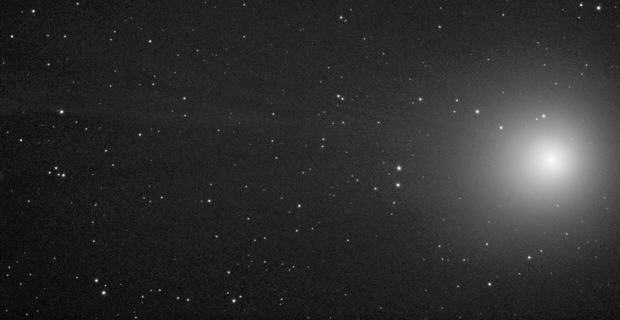 Das obenstehende Bild ist auf den Kometenkern zentriert. Dadurch werden die Sterne zu Strichspuren auseinandergezogen. Der Schweif erstreckt sich in östliche Richtung. Seine gewaltige Länge ist in dieser Darstellung allerdings nicht zu erkennen. Die Einzelbilder wurden etwas im Kontrast angehoben, damit sich der Schweif vom Untergrund abhebt. Dadurch ist der Kern überbelichtet. Aufziehender Dunst bendete die Aufnahmeserie. Hier iat eine Aufnahme, auf der die Galaxien im Umfeld des Kometen eingezeichnet sind. Datum: 13.02.14, 21:29h MEZ Optik: f=750 mm f/5,4 Nachführung: TVGuider mit Watec 120N am C5 f/10 Gesamtbelichtungszeit: 63 min (Einzelbilder: 180 Sekunden) Kamera: Atik 460EX