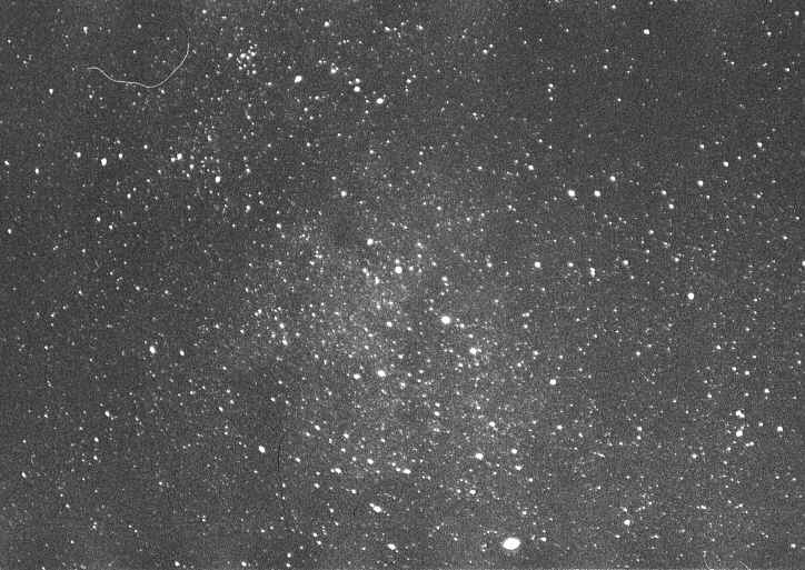 Astrofotografie vom Fotostativ Milchstraße zwischen Deneb und M 39. Der Nordamerikanebel (NGC 7000), eine HII-Region, ist nicht als solcher sichtbar, da der verwendete Film nicht mehr für die Emissionslinien von H-alpha empfindlich ist. Das hatte ich vorher nicht gewußt. Unten am Bildrand: Deneb. Oben links der Mitte: M 39.