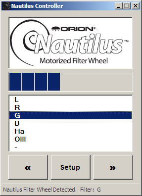 Das Anwählen der Filter erfolgt über ein kleines Programm, den Nautilus Controller, bei dem man den Filtern über das Menü Setup Namen geben kann. Die jeweiligen Filter werden entweder durch Anklicken des Namens direkt angewählt, oder das Filterrad wird durch Anklicken der Pfeiltasten jeweils um eine Position vor- und zurückgedreht. Fazit