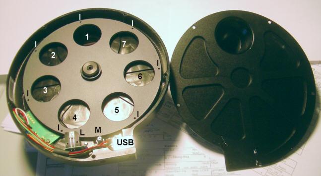 OSDV, bot mir für die Zeit der Reparatur ein anderes USB-Filterrad, das Nautilus, als Ersatzgerät an. Das fand ich doch sehr großzügig, zumal das Nautilus mit 7 Filterplätzen genau zwei mehr als mein Atik-Filterrad aufwies. Das Filterrad wird in Portugal von der Firma
