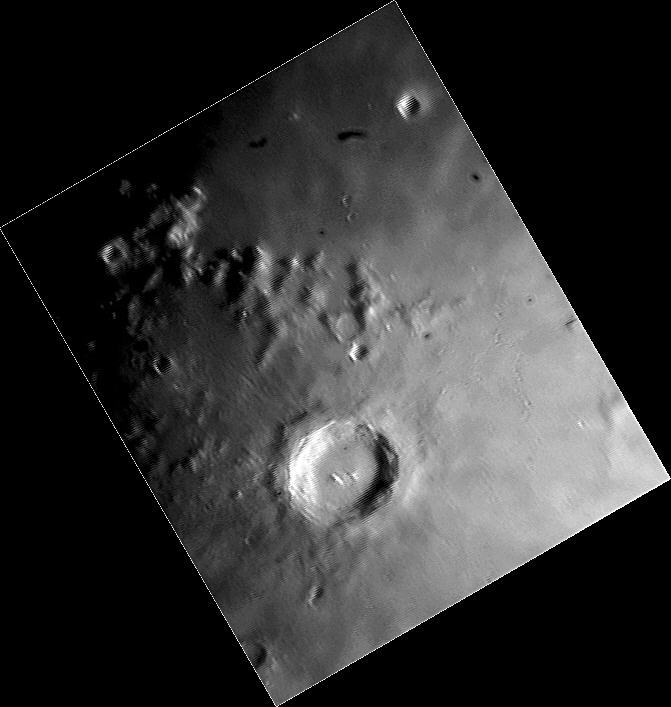 Das nebenstehende Bild zeigt den Krater Kopernikus. Es ist ein Ausschnitt aus einem Einzelbild, das mit der Mintron MTV-12V1C am C9.25 bei 2350 mm Brennweite gemacht wurde. Die schwarzen Flecken sind Staub auf dem Fenster des CCD-Chips. |