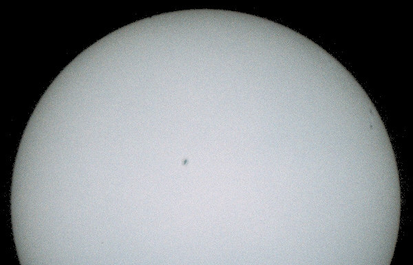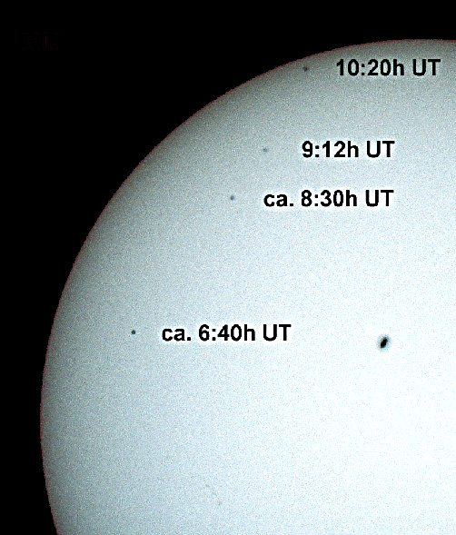 Der Mai 2003 war astronomisch gesehen einer der Höhepunkte im Jahre 2003: Erst der Transit des Merkurs vor der Sonnenscheibe, dann die Mondfinsternis und am Ende des Monats noch eine partielle Sonnenfinsternis. Aus diesem Anlaß hatte ich ein paar Wochen vorher Besuch von der örtlichen Presse, die mich zu den bevorstehenden astronomischen Ereignissen und zu meinem Hobby im Allgemeinen interviewte und nebst Teleskop auch ablichtete. Die Astro-AG der VHS Buxtehude hatte zur Beobachtung auf freiem Feld am Stadtrand von Buxtehude eingeladen. Leider kamen nicht allzu viele Leute am frühen Morgen vorbei. Der Wettergott hatte es gut mit uns gemeint und die Wolken rissen auf und ließen den Blick auf die Sonne während des größten Teils des Transits zu. ![]() Brennweite 2350mm, f/10, 1/1000s auf Kodak Royal Gold 400, Sonnenfilter ND5 Das obige Bild entstand aus mehreren Einzelaufnahmen, die übereinanderkopiert wurden. Das untere Bild ist eine EInzelaufnahme, kurz bevor der Merkur die Sonnenscheibe wieder komplett verlassen hatte. ![]() Die Sonnenaktivität bewegte sich ja schon wieder auf das Minimum zu. Dennoch zierten einige Flecken das Antlitz der Sonne und machten einen netten Größenvergleich zwischen dem Bild des Merkurs und den Flecken, von denen diejenigen am Rand sogar von Fackeln umgeben waren, möglich. So war der Merkur-Transit schon einmal ein Vorgeschmack auf den viel selteneren Venus-Transit am 08.06.2004. |