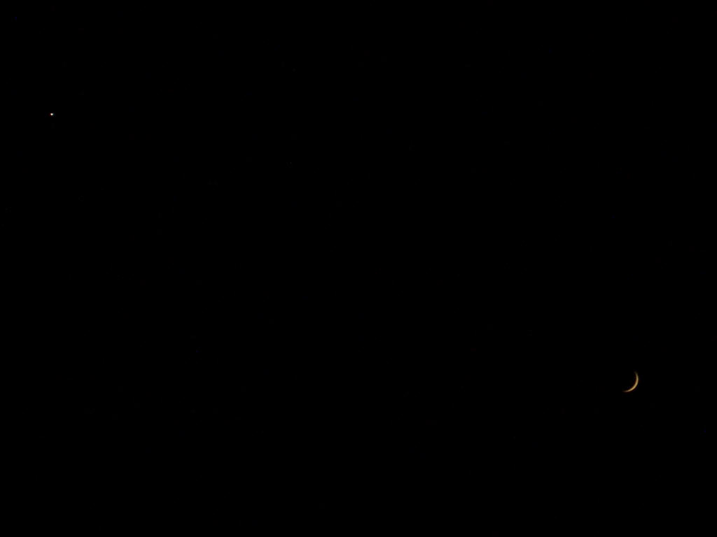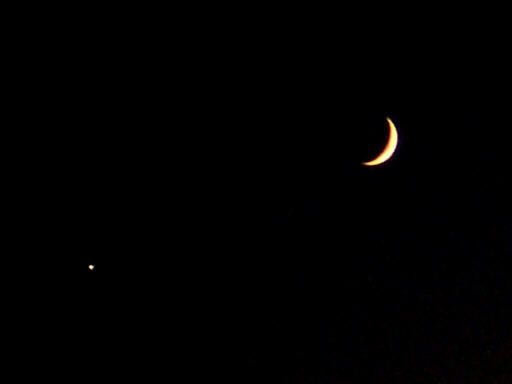Am nächsten Tag, dem 31.12.2008, passierte die Mondsichel Venus in etwa 2° Abstand. Datum: 31.12.08, 17:40h MEZ Optik: f=17,4 mm, = Digitalkamera 3x Zoom + 1,5x Digitalzoom Nachführung: keine, vom Stativ Belichtungszeit: automatisch Kamera: Digitalkamera Pentax Optio S, 3,2 Megapixel, Empfindlichkeitseinstellung : Auto