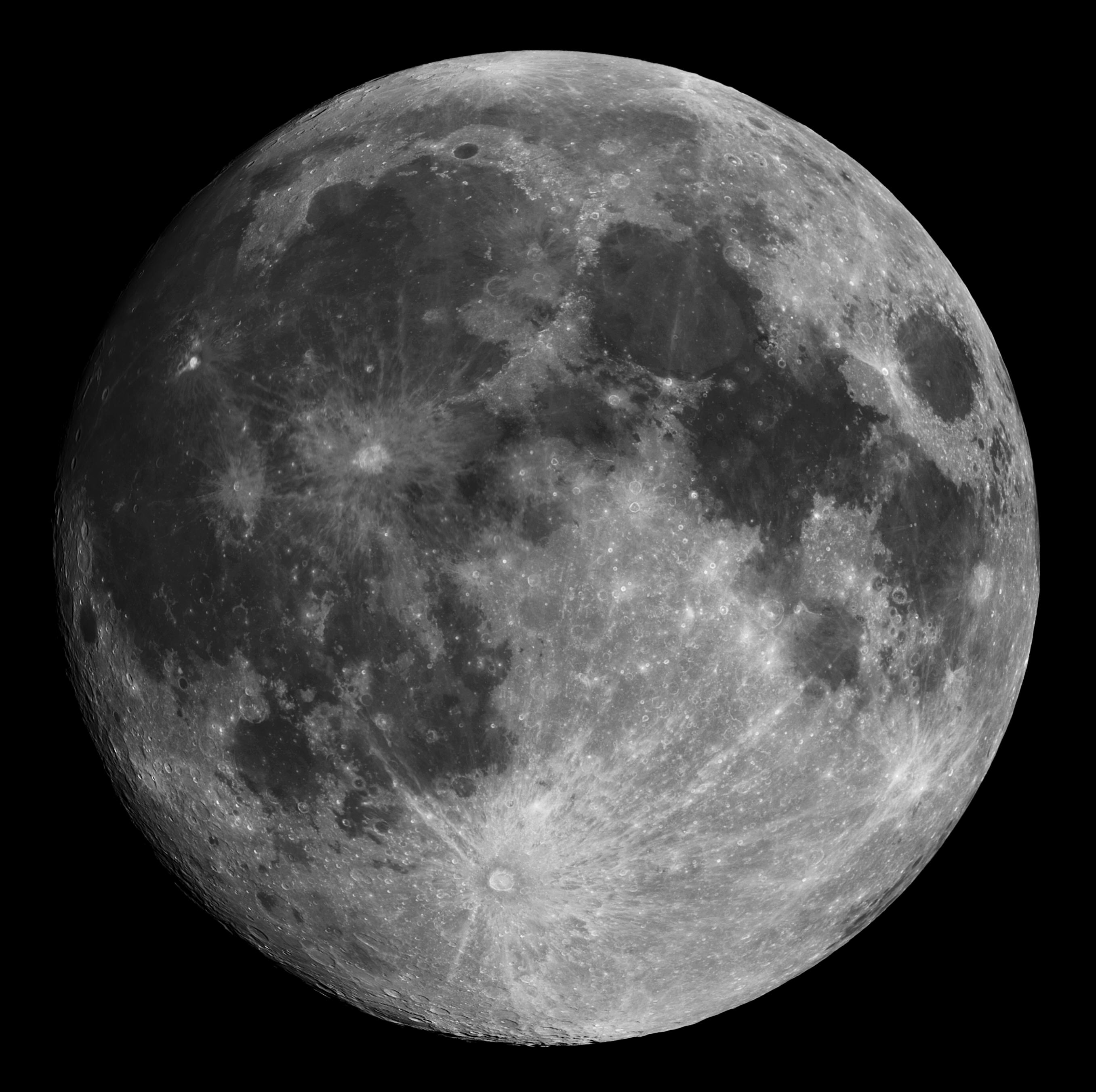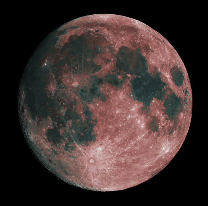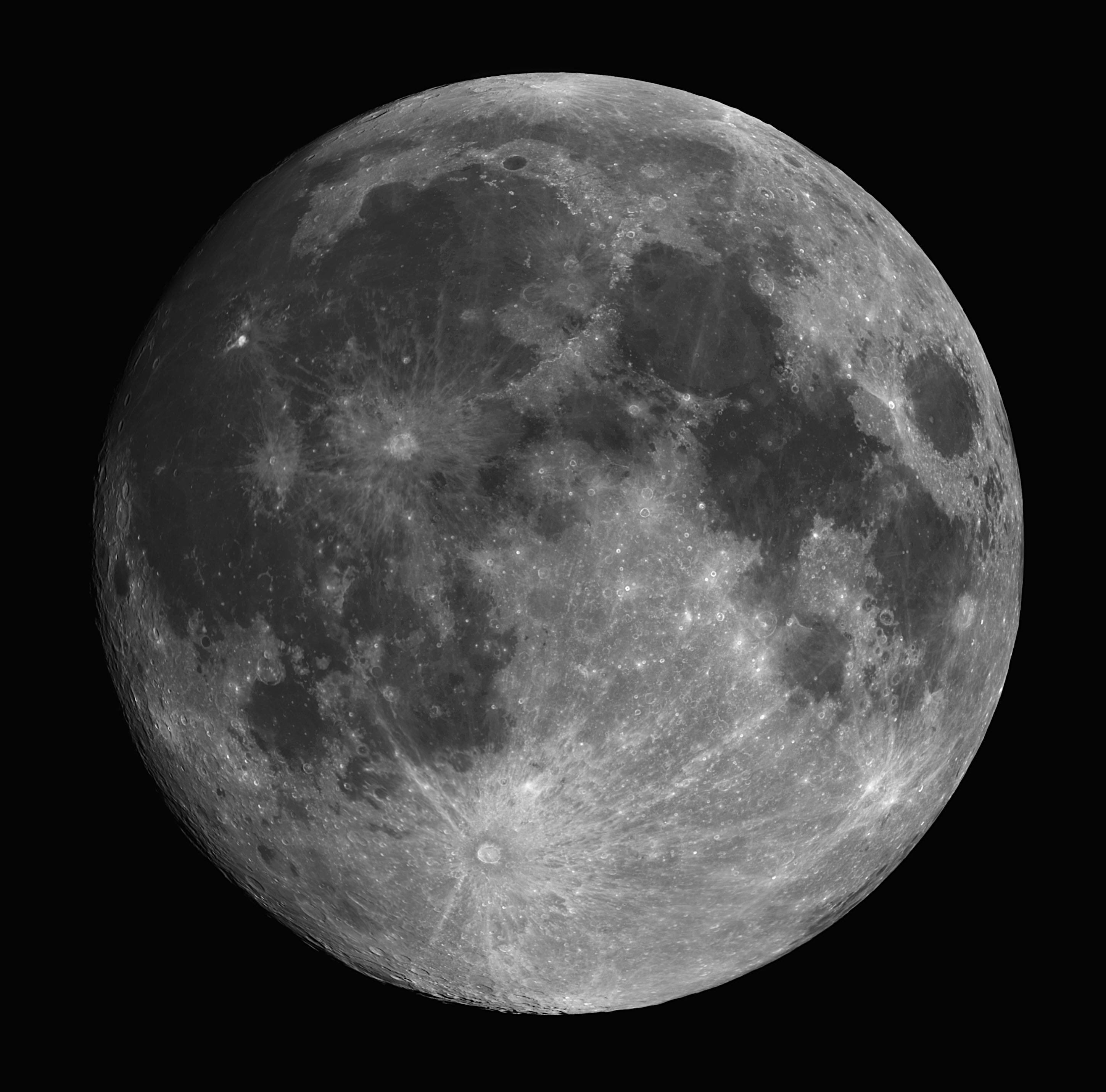 An diesem Abend wolte ich nur meine umgebaute Montierung testen. Da störte auch der fast volle Mond nicht. Aber weil er schon mal da war und recht hoch am Himmel stand, habe ich mal mit der CCD-Kamera draufgehalten. Allerdings ist der Mond so hell, dass sein Licht stark gedämpft werden muss. Ein Schmalbandfilter, der nur einen kleinen Bruchteil des sichtbaren Spektrums durch lässt, erfüllt diese Aufgabe hervorragend und lässt dennoch so kurze Belichtungszeiten zu, dass die Luftunruhe nicht zum Tragen kommt. Die obige Aufnahme wurde durch einen Hα-Filter gemacht. Datum: 18.02.19, 21:17h MEZ Optik: f=750 mm f/5,4 Nachführung: keine Gesamtbelichtungszeit: 2,04 Sekunden (Einzelbilder: 0,02 Sekunden) Kamera: Atik 460EX Filter: 6 nm Hα von Astronomik