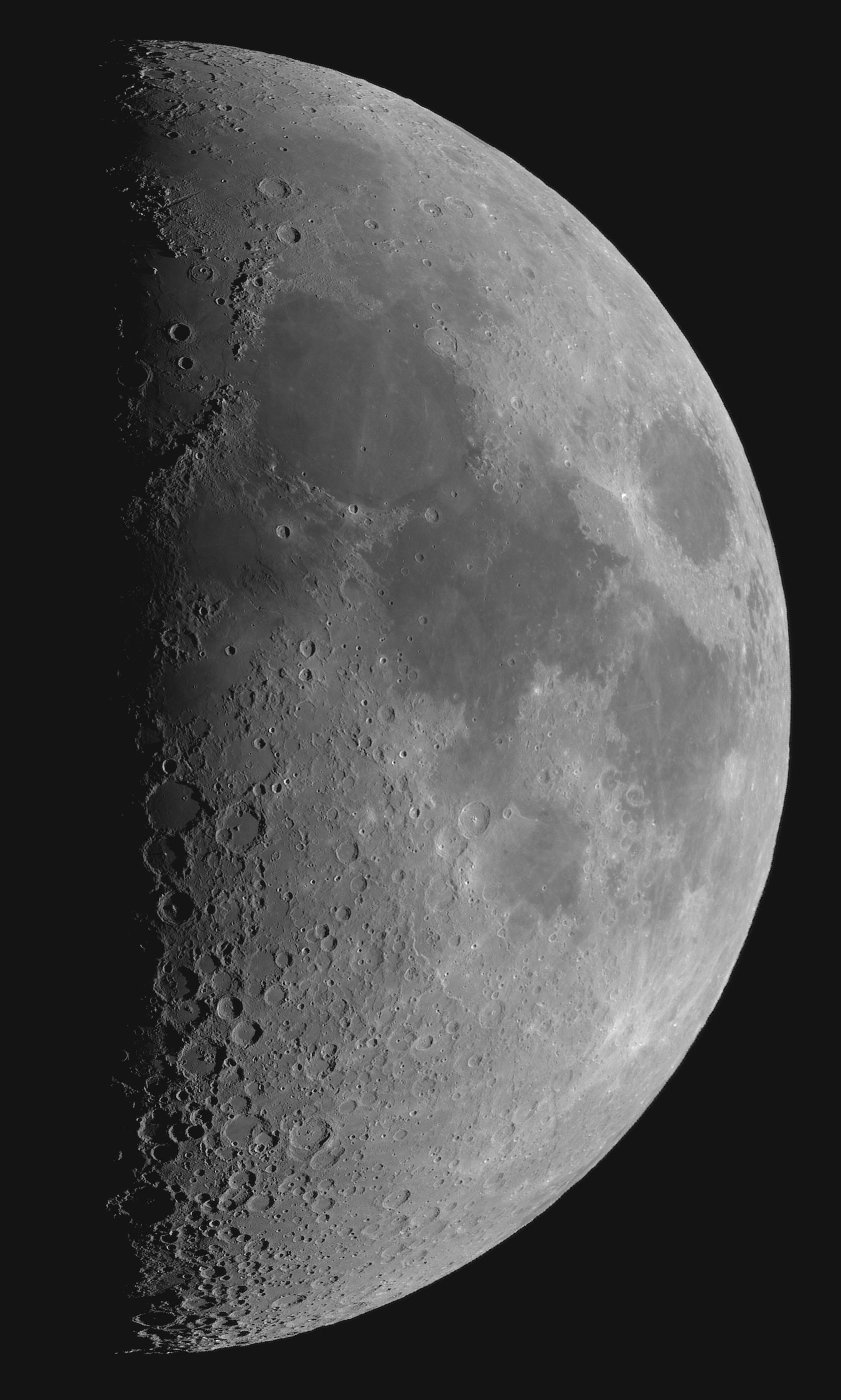 Nach meinen Mondaufnahmen aus dem Februar wollte ich auch den Halbmond ablichten. Dazu nahm ich 600 Einzelbilder auf, die mit Astrostakkert gestackt wurden. Die weitere Bearbeitung erfolgte mit meinen üblichen Programmen. Um noch möglichst viel Details am Terminator zeigen zu können, ohne dass der Mond am hellen Rand überbelichtet wird, musste ich den Kontrast so anpassen, dass der Anblick etwas ungewohnt wirkt. Bei der natürlichen Darstellung wäre der rechte Rand sehr hell, während der Mond zum Terminator hin immer dunkler würde, so dass am Terminator nur kaum Einzelheiten erkennbar sind. Durch eine entsprechende Anpassung der Helligkeitsverteilung des Bilds (Aufhellen der Terminatorregion und Abdunkeln des rechten Mondrands) gelang es, beides darzustellen. Allerdings litt dadurch naturgemäß der Hell-Dunkel-Kontrast.