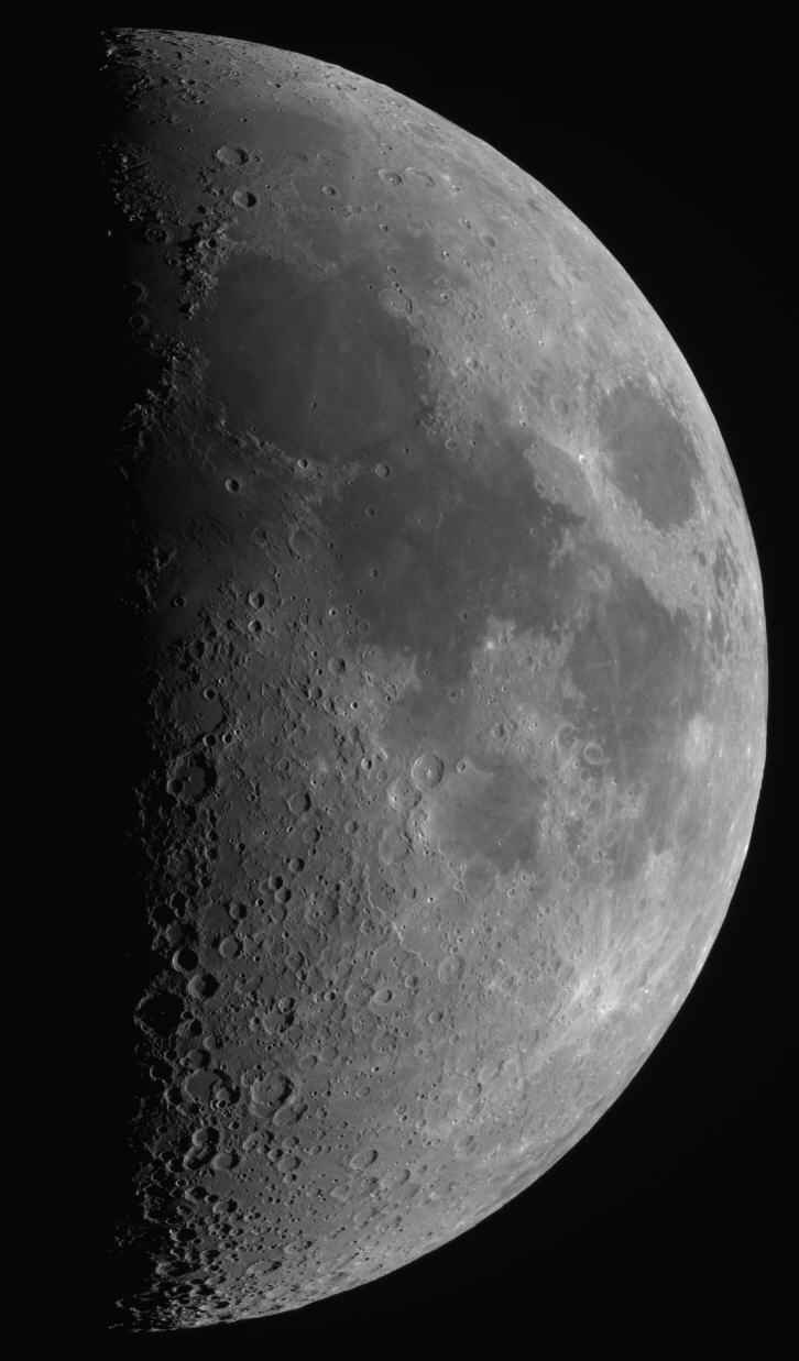 Da der Mond einen Tag vor dem ersten Viertel noch hoch am Himmel stand und den Himmel für Deep SKy Aufnahmen noch zu sehr aufhellte, wollte ich dann wenigstens den Mond aufnehmen und einige Bereiche in der Nähe des Terminators im Details zeigen. Da wäre zunächst das Alpental in den Mondalpen und zum anderen die Hyginusrille Rima Hyginus, ein Lavakanal, dessen Decke eingestürzt ist. Derartige Rillen gibt es etliche auf dem Mond. Außerdem wurde das Gebiet um den Krater Theophilus herausvergrößert. Diese Objekte werden beim Klick auf die Links im Dateil gezeigt. Für die Aufnahme nahm ich lediglich 105 Einzelbilder auf, die mit Astrostakkert gestackt wurden. Die weitere Bearbeitung erfolgte mit meinen üblichen Programmen. Um noch möglichst viel Details am Terminator zeigen zu können, ohne dass der Mond am hellen Rand überbelichtet wird, musste ich den Kontrast so anpassen, dass der Anblick etwas ungewohnt wirkt. Bei der natürlichen Darstellung wäre der rechte Rand sehr hell, während der Mond zum Terminator hin immer dunkler würde, so dass am Terminator nur kaum Einzelheiten erkennbar sind. Durch eine entsprechende Anpassung der Helligkeitsverteilung des Bilds (Aufhellen der Terminatorregion und Abdunkeln des rechten Mondrands) gelang es, beides darzustellen. Allerdings litt dadurch naturgemäß der Hell-Dunkel-Kontrast. Datum: 11.05.19, 23:39h MESZ Optik: f=750 mm f/5,4 Nachführung: keine Gesamtbelichtungszeit: 4,2 Sekunden (Einzelbilder: 0,04 Sekunden) Kamera: Atik 460EX Filter: 12 nm [OIII] von Astronomik