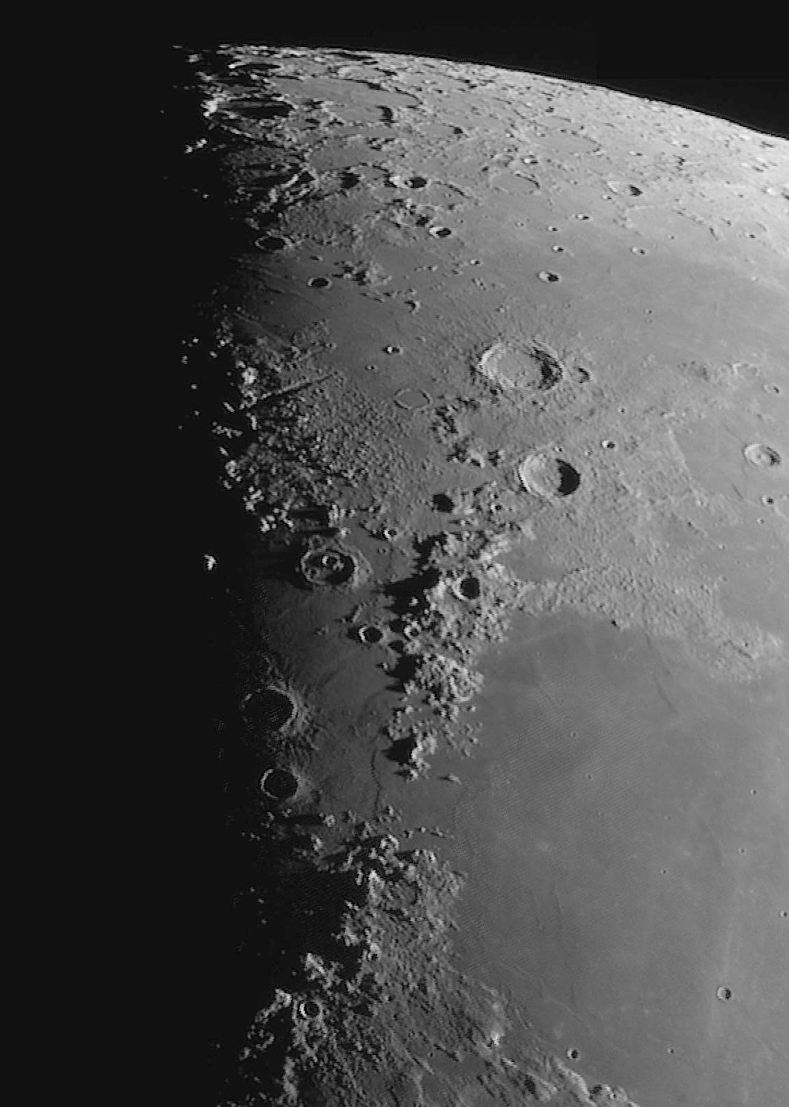 Das Gebirge am Terminator etwas oberhalb der Bildmitte sind die Montes Alpes, die Mondalpen. Durch die Berge zieht sich ein Einschnitt nach Nordwesten, das Alpental. Es ist für viuelle Beobachter immer wieder ein schöner Anblick. Bei guter Sicht ist auf seinem Grund eine Rille erkennbar. Dafür reicht die Auflösung meiner Aufnahme nicht aus. Außerdem liegt der Talgrund noch im Schatten der umgebenden Berge. Die beiden prominenten Krater rechts davon sind Aristoteles (oben) und Eudoxos. Südlich von Eudoxos liegen die Montes Kaukasus und werfen lange Schatten auf die Mondoberfläche.
