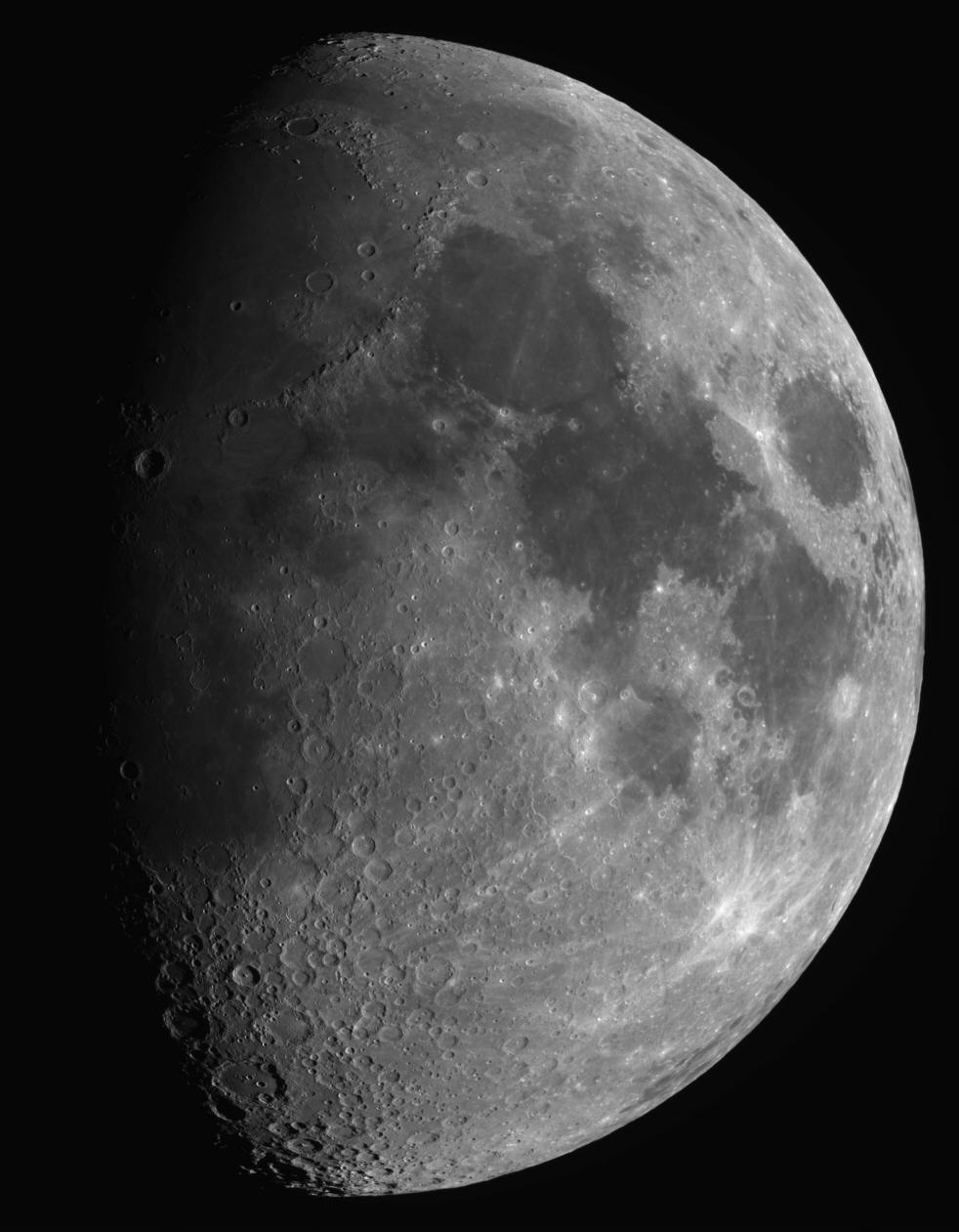 Da der Mond einen Tag nach dem ersten Viertel noch hoch am Himmel stand und den Himmel für Deep SKy Aufnahmen noch zu sehr aufhellte, wollte ich dann wenigstens den Mond aufnehmen und einige Bereiche in der Nähe des Terminators im Details zeigen. Da wäre zunächst der Krater Copernicus südlich des Regenmeers (Mare Imbrium) und zum anderen die Kraterlandschaft um den Krater Tycho. An diesem Tag war die sogenannte "Lange Wand", die in Wirklichkeit nur eine sanfte Steigung als eine steile Wand ist, besonders gut sichtbar. Diese Objekte werden beim Klick auf die Links im Dateil gezeigt. Für die Aufnahme nahm ich 400 Einzelbilder auf, die mit Astrostakkert gestackt wurden. Die weitere Bearbeitung erfolgte mit meinen üblichen Programmen. Um noch möglichst viel Details am Terminator zeigen zu können, ohne dass der Mond am hellen Rand überbelichtet wird, musste ich den Kontrast so anpassen, dass der Anblick etwas ungewohnt wirkt. Bei der natürlichen Darstellung wäre der rechte Rand sehr hell, während der Mond zum Terminator hin immer dunkler würde, so dass am Terminator nur kaum Einzelheiten erkennbar sind. Durch eine entsprechende Anpassung der Helligkeitsverteilung des Bilds (Aufhellen der Terminatorregion und Abdunkeln des rechten Mondrands) gelang es, beides darzustellen. Allerdings litt dadurch naturgemäß der Hell-Dunkel-Kontrast. Datum: 13.05.19, 23:04h MESZ Optik: f=750 mm f/5,4 Nachführung: keine Gesamtbelichtungszeit: 12,0 Sekunden (Einzelbilder: 0,03 Sekunden) Kamera: Atik 460EX Filter: 12 nm [OIII] von Astronomik