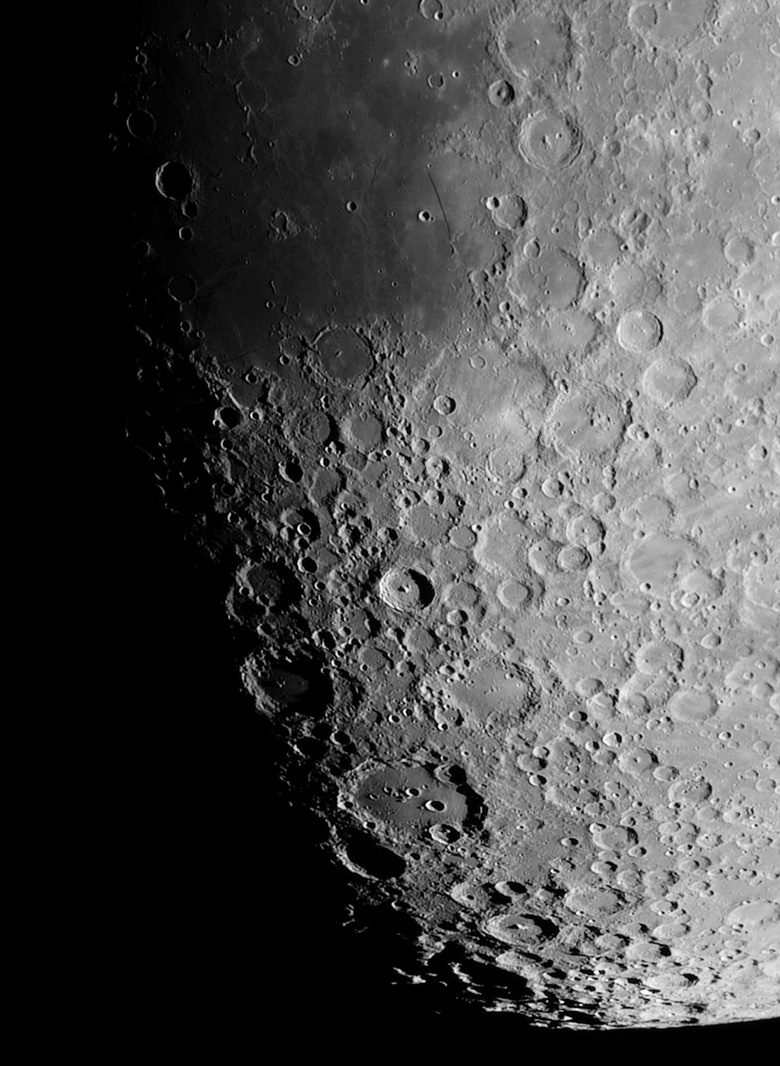 Die obere Bildhälfte zeigt die sogenannte "Lange Wand", die in Wirklichkeit nur eine sanfte Steigung als eine steile Wand ist. Die untere Bildhälfte wird vom Krater Tycho mit seinem Zentralberg dominiert. Darunter befindet sich die Walleebe Clavius, ein mit Lava gefluteter Krater, in dem weitere, jüngere Krater sichtbar sind. Die obige Aufnahme wurde durch einen [OIII]-Filter gemacht.