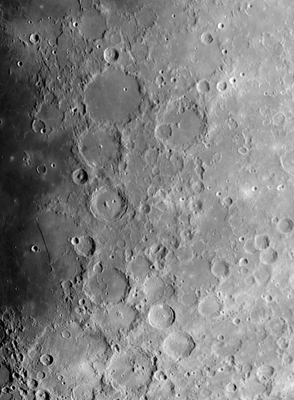 Einen Tag nach dem ersten Viertel war die sogenannte "Lange Wand", die in Wirklichkeit nur eine sanfte Steigung als eine steile Wand ist, besonders gut sichtbar. Die Lange Wand befindet sich am linken Bildrand. In der Bildmitte zieht sich eine Kette von Kratern von oben nach unten. Es sind (von oben) die Krater Ptolemaeus, Alphonsus und Arzachel. Die obige Aufnahme wurde durch einen [OIII]-Filter gemacht.