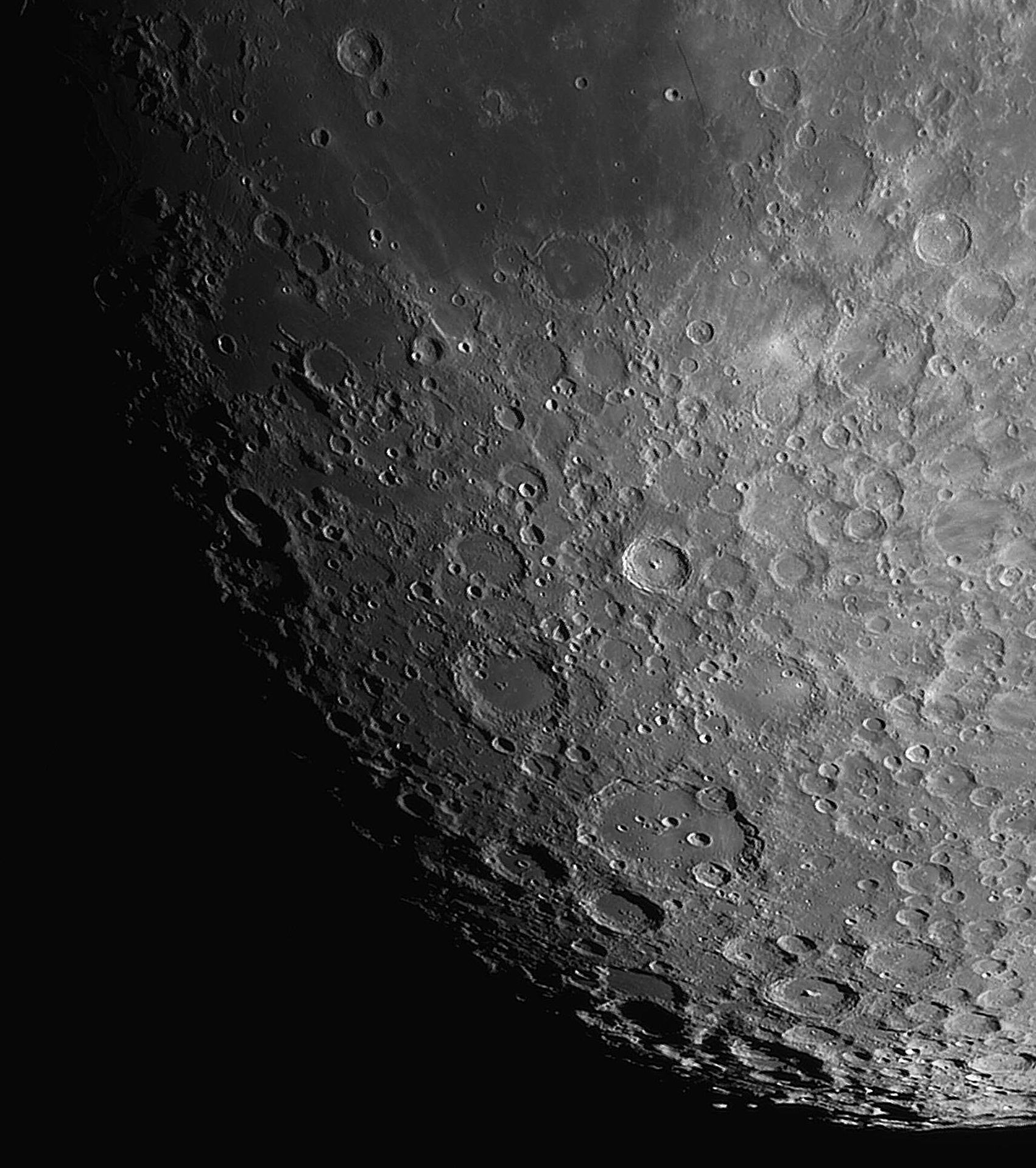 Nach meinen Mondaufnahmen aus Februar und April wollte ich auch den sogenannten "Goldenen Henkel" ablichten. An diesem Tag war die sogenannte "Lange Wand", die in Wirklichkeit nur eine sanfte Steigung als eine steile Wand ist, ebenfalls gut sichtbar. Die Lange Wand befindet sich am oberen Bildrand. Etwa in der Bildmitte sticht der Krater Tycho in diesem Ausschnitt besonders hervor. Die obige Aufnahme wurde durch einen [OIII]-Filter gemacht. Datum: 14.05.19, 22:58h MESZ Optik: f=750 mm f/5,4 Nachführung: keine Gesamtbelichtungszeit: 7,2 Sekunden (Einzelbilder: 0,02 Sekunden) Kamera: Atik 460EX Filter: 12 nm [OIII] von Astronomik |